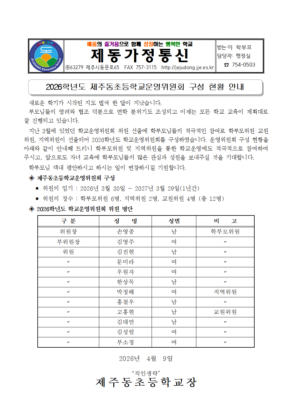 2026학년도 제주동초등학교운영위원회 구성 현황 안내