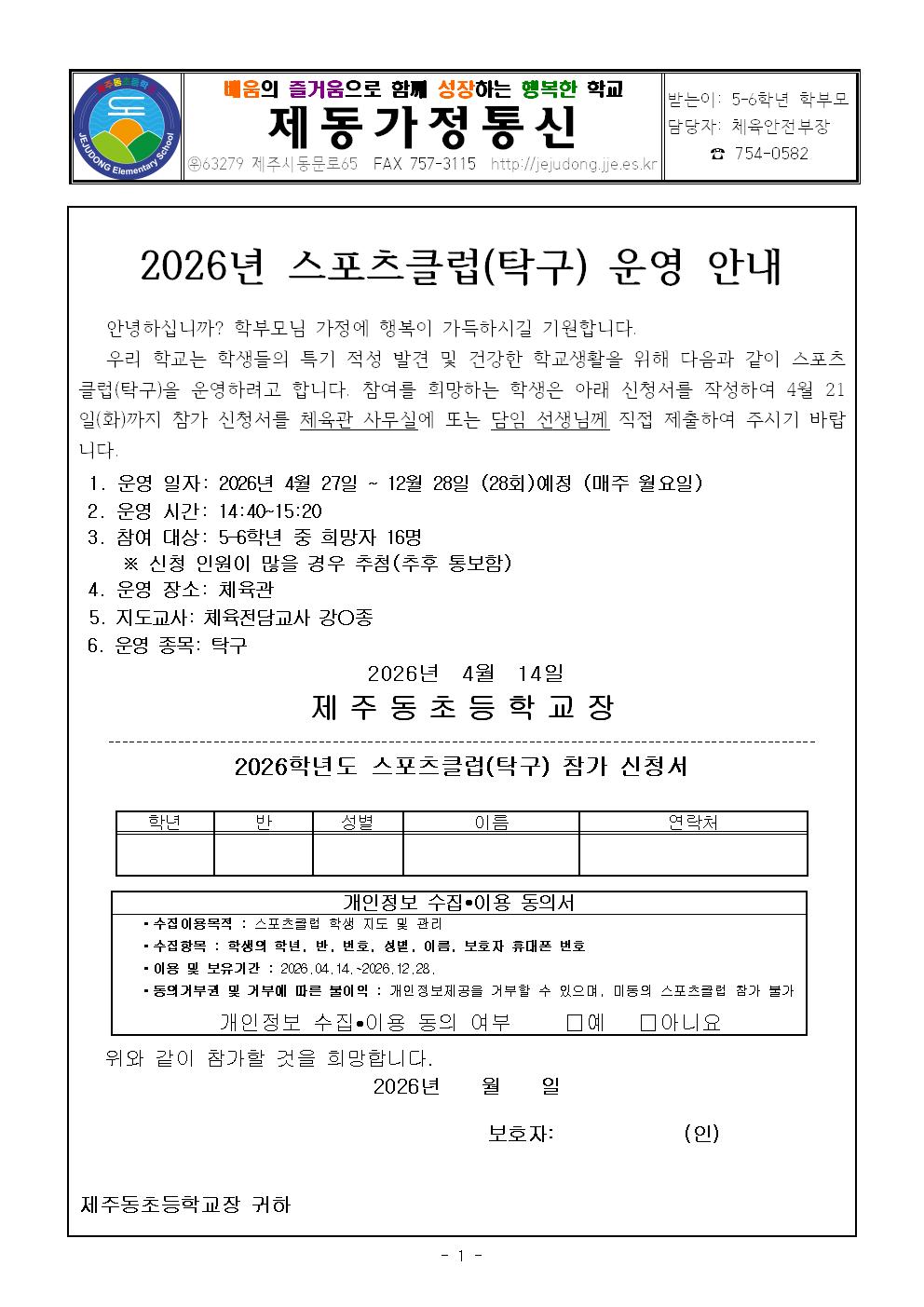 2026년 스포츠클럽(탁구) 운영 안내