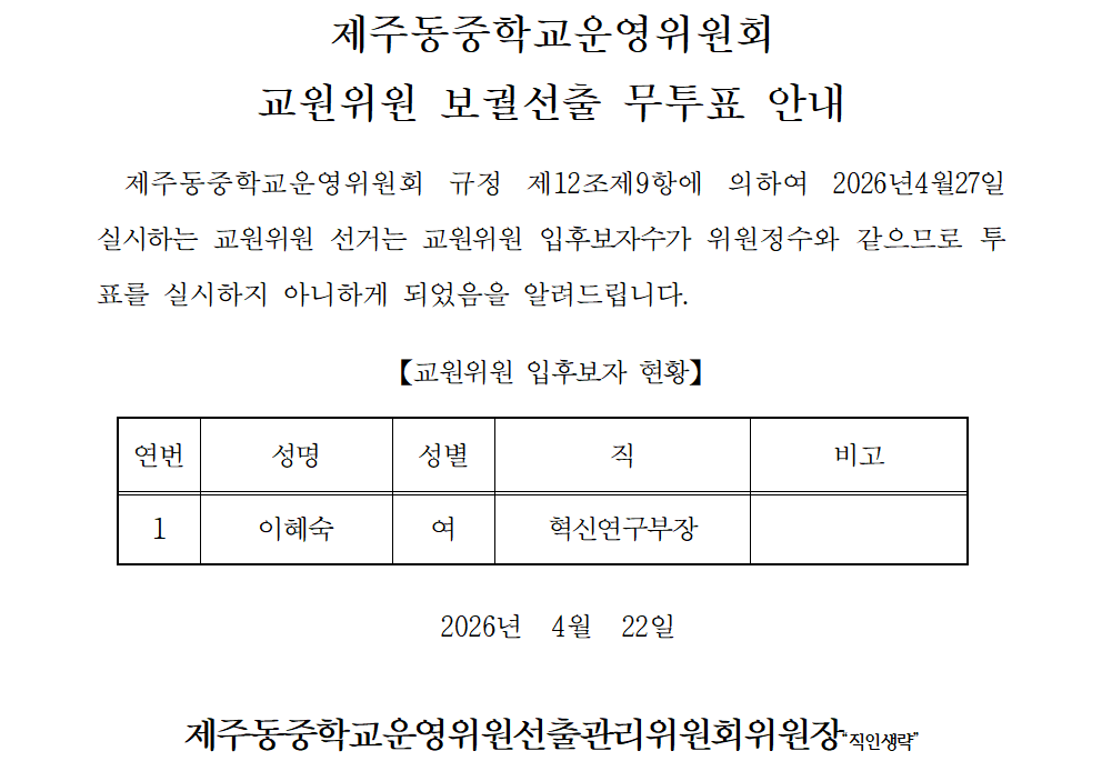 2026학년도 제주동중학교운영위원회 교원위원 보궐선출 무투표 안내