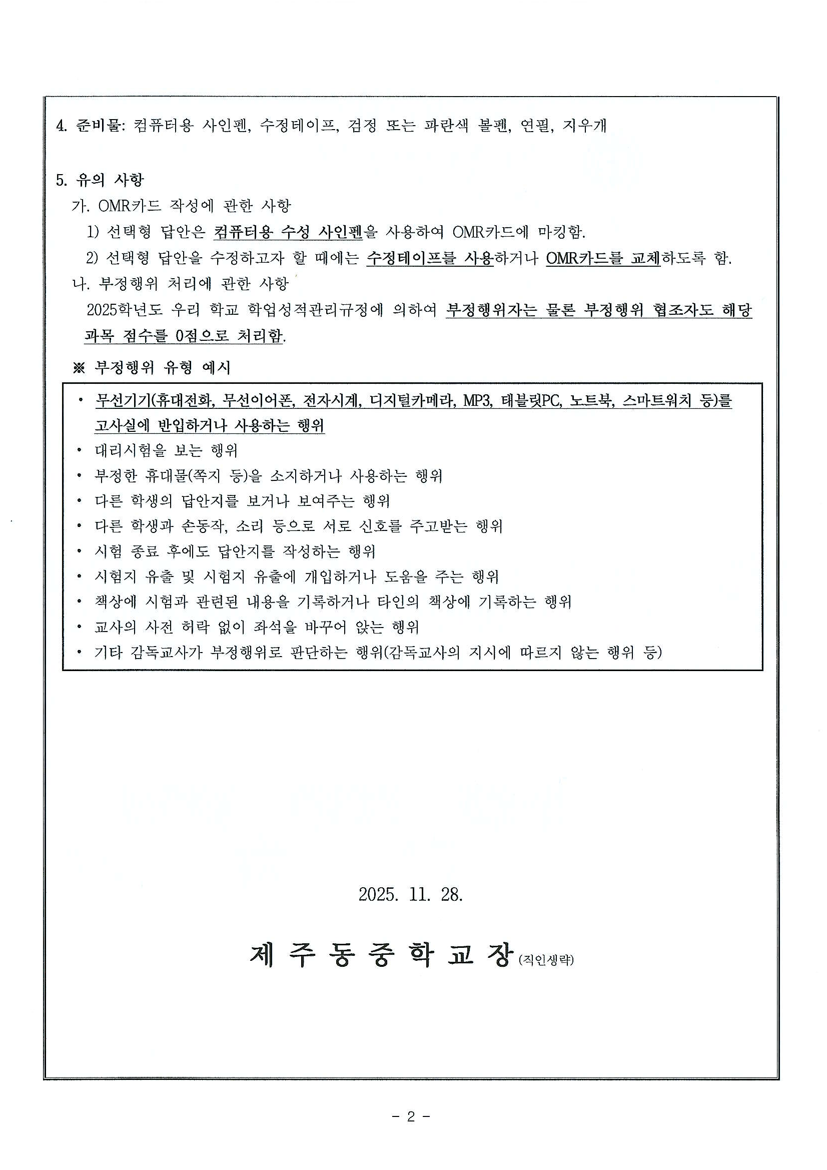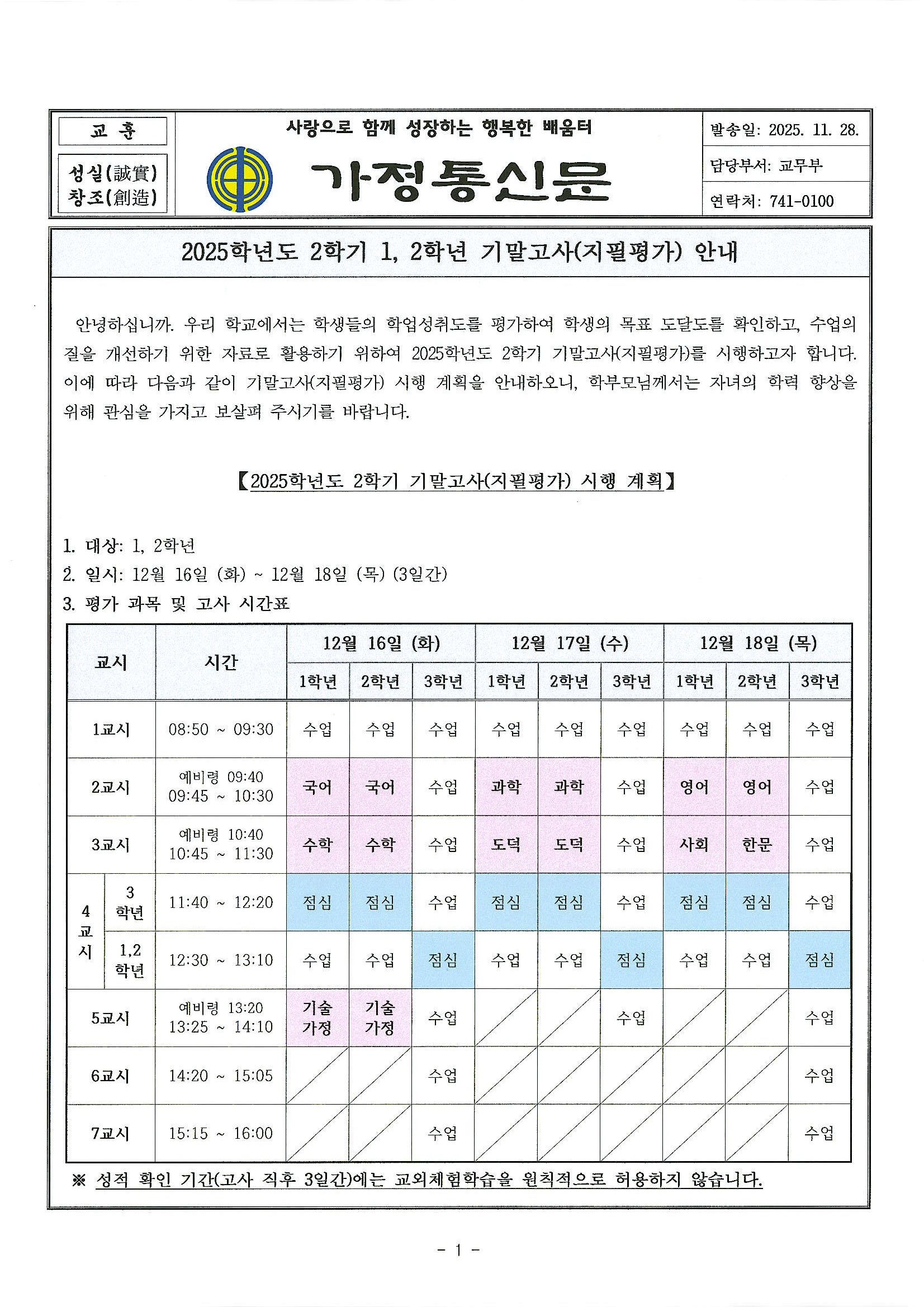 2025학년도 2학기 1, 2학년 기말고사(지필평가) 안내