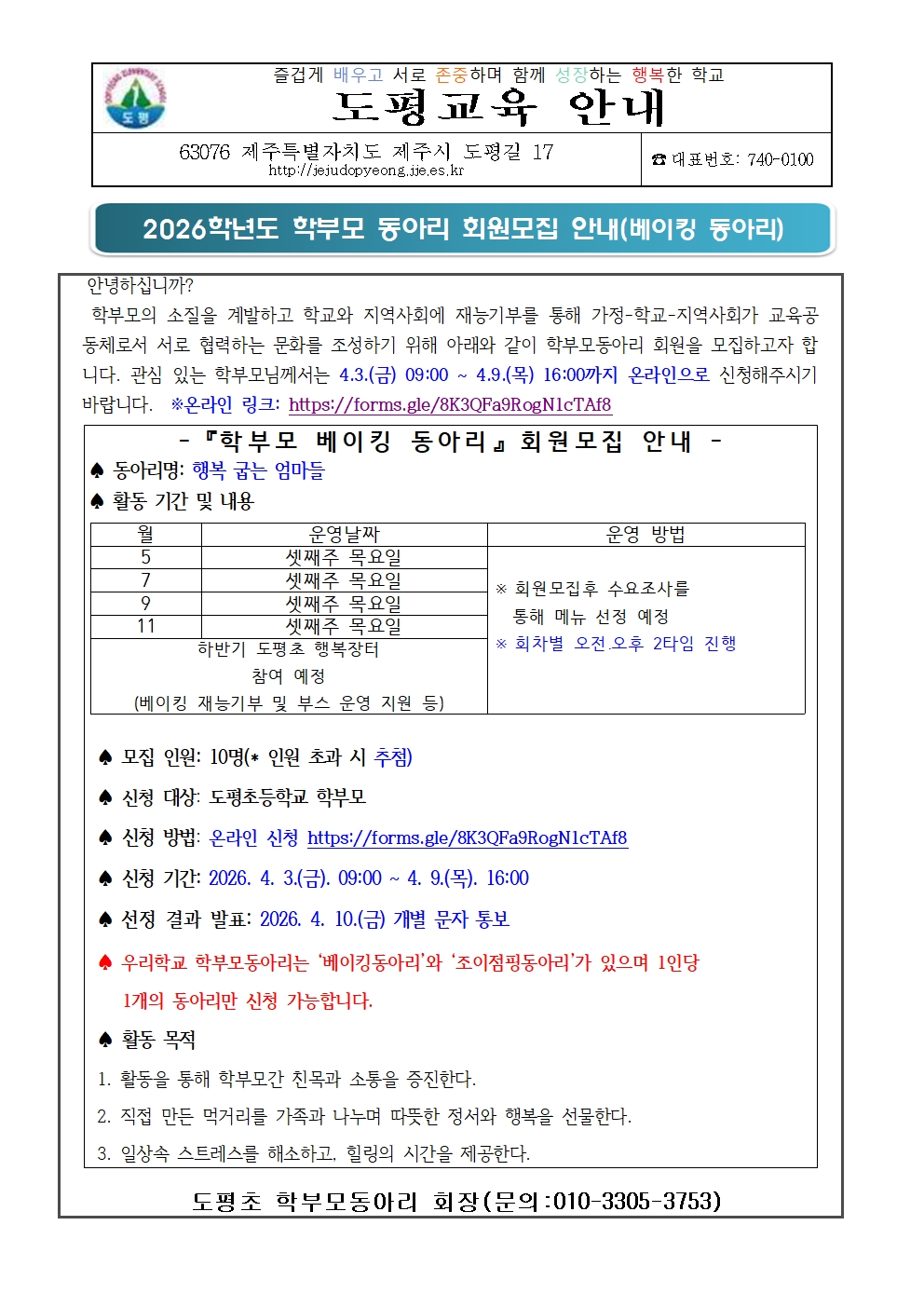 2026학년도 도평초 학부모 동아리 회원모집 안내(베이킹 동아리)