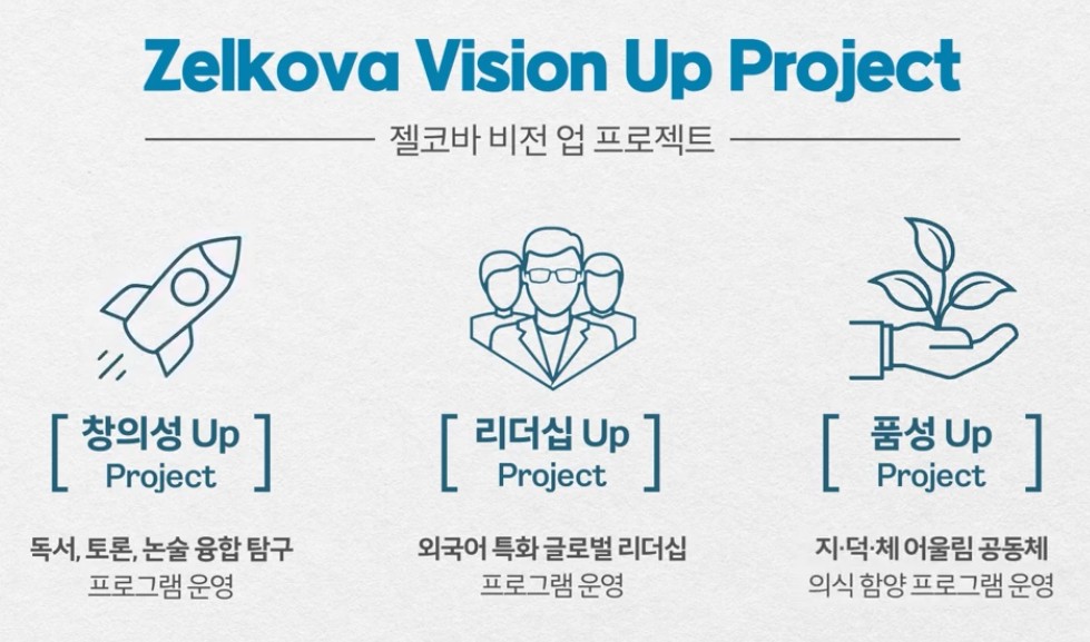 이에 따른 실천과제로 학생 개개인의 잠재력을 발휘하고 전인적 성장을 바탕으로 조화로운 글로벌 인재를 육성하기 위해 젤코바 비전 업 프로젝트를 계속 추진한다. 이에 따른 세부추진 과제로 다음 세 개의 프로그램을 운영한다.