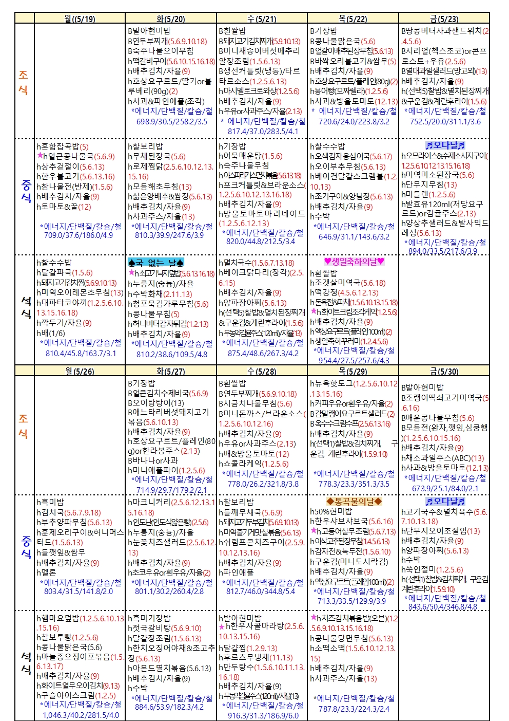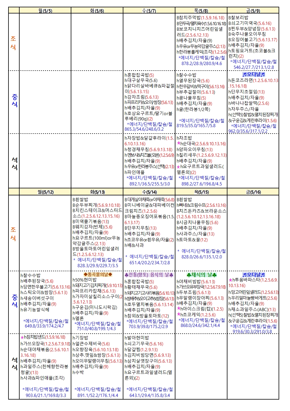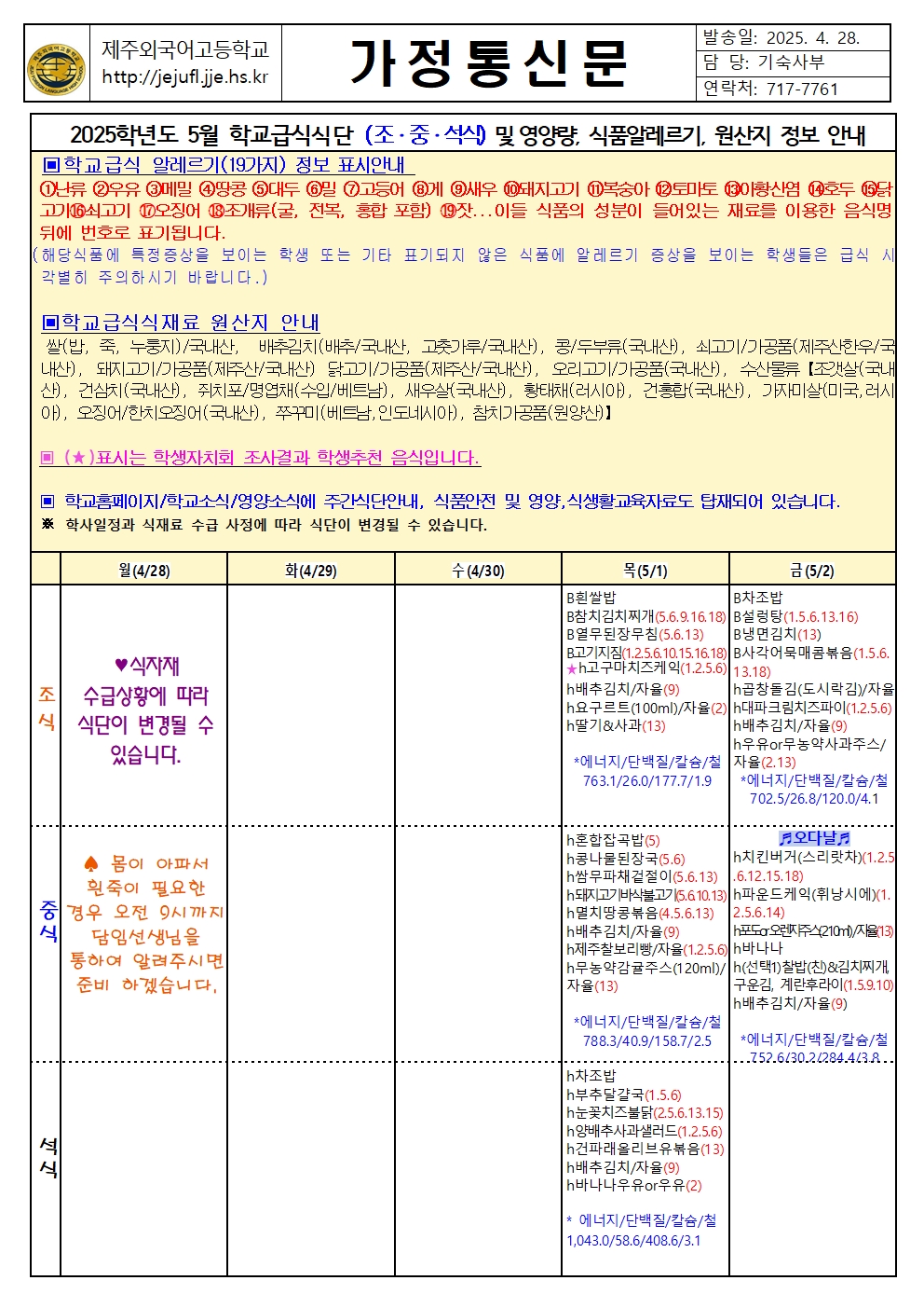 2025년 5월 학교급식 식단(조,중,석식) 및 영양량, 식품알레르기, 원산지 정보 안내