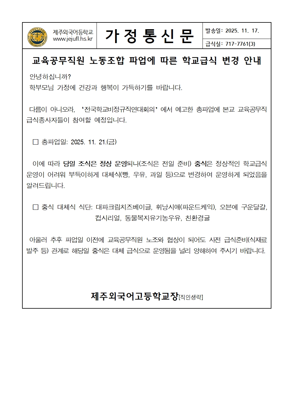 교육공무직원 노동조합 파업에 따른 학교급식 변경 안내