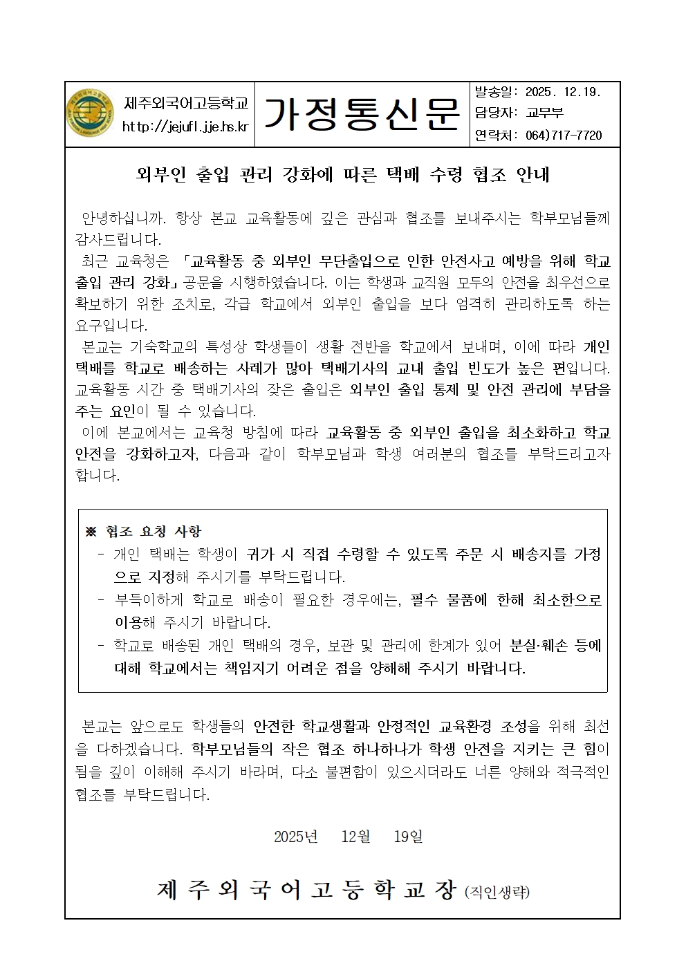 외부인 출입 관리 강화에 따른 택배 수령 협조 안내