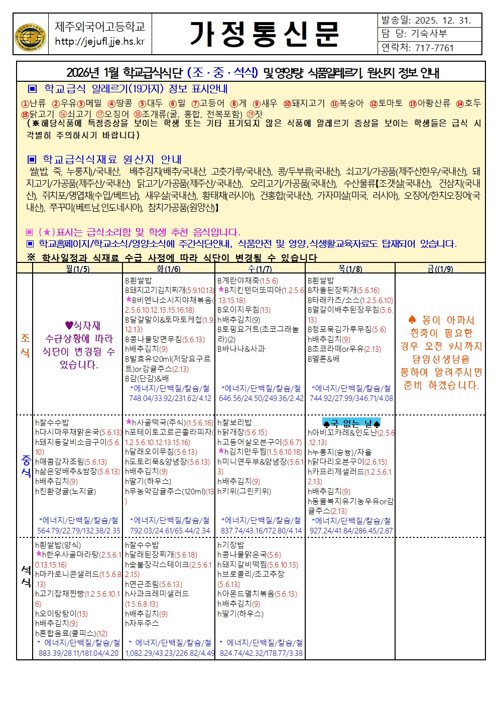 2026년 1월 학교급식 식단(조,중,석식) 및 영양량, 식품알레르기, 원산지 정보 안내