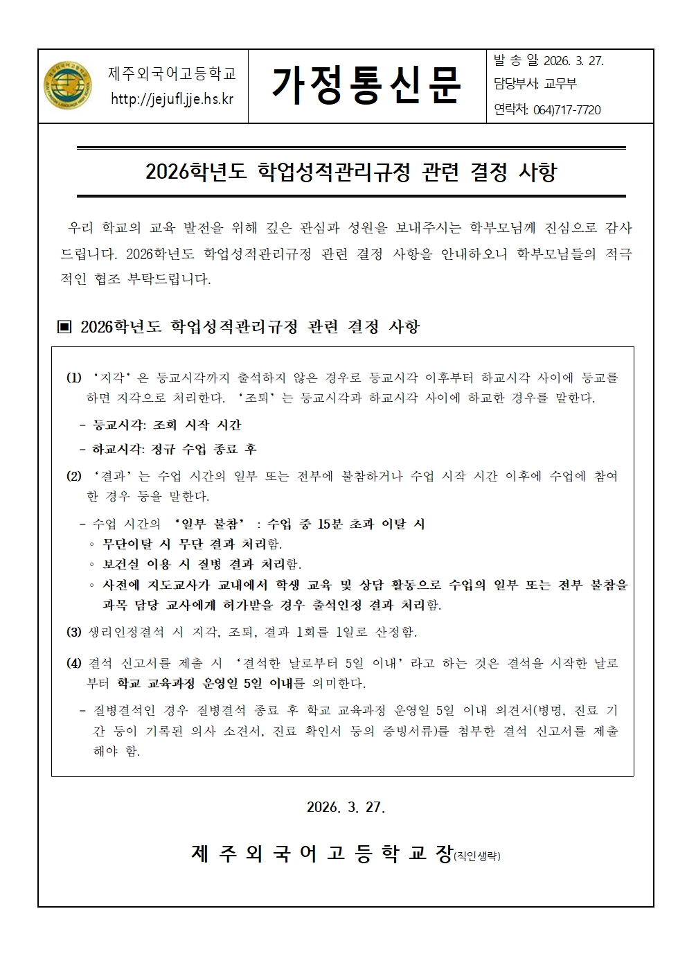 (가정통신문) 2026학년도 학업성적관리규정 관련 결정 사항