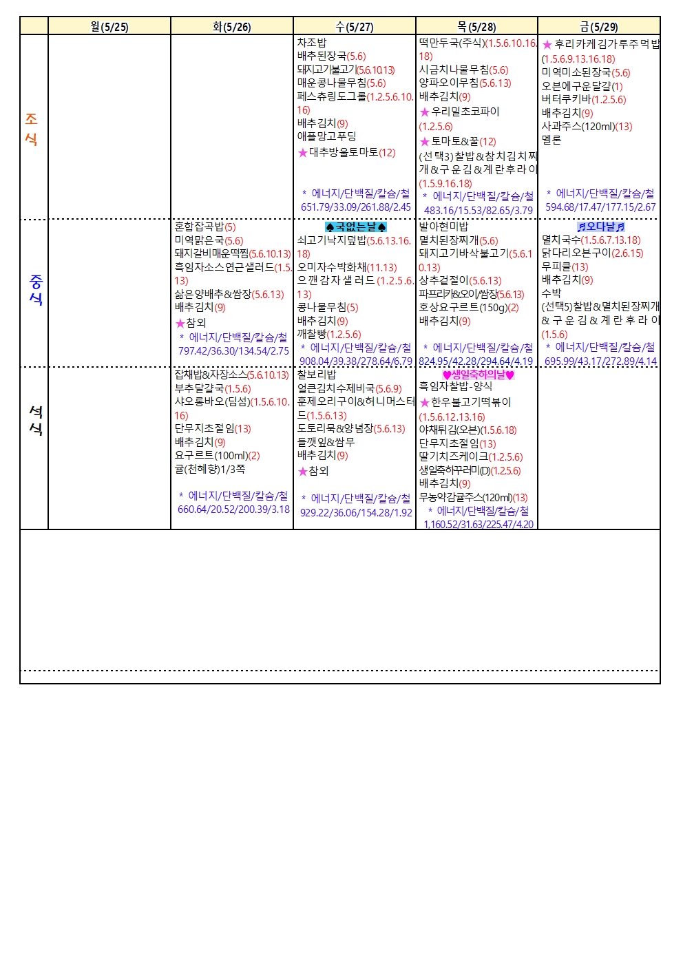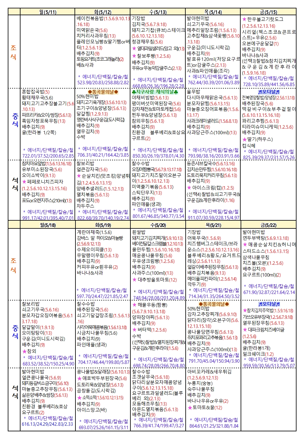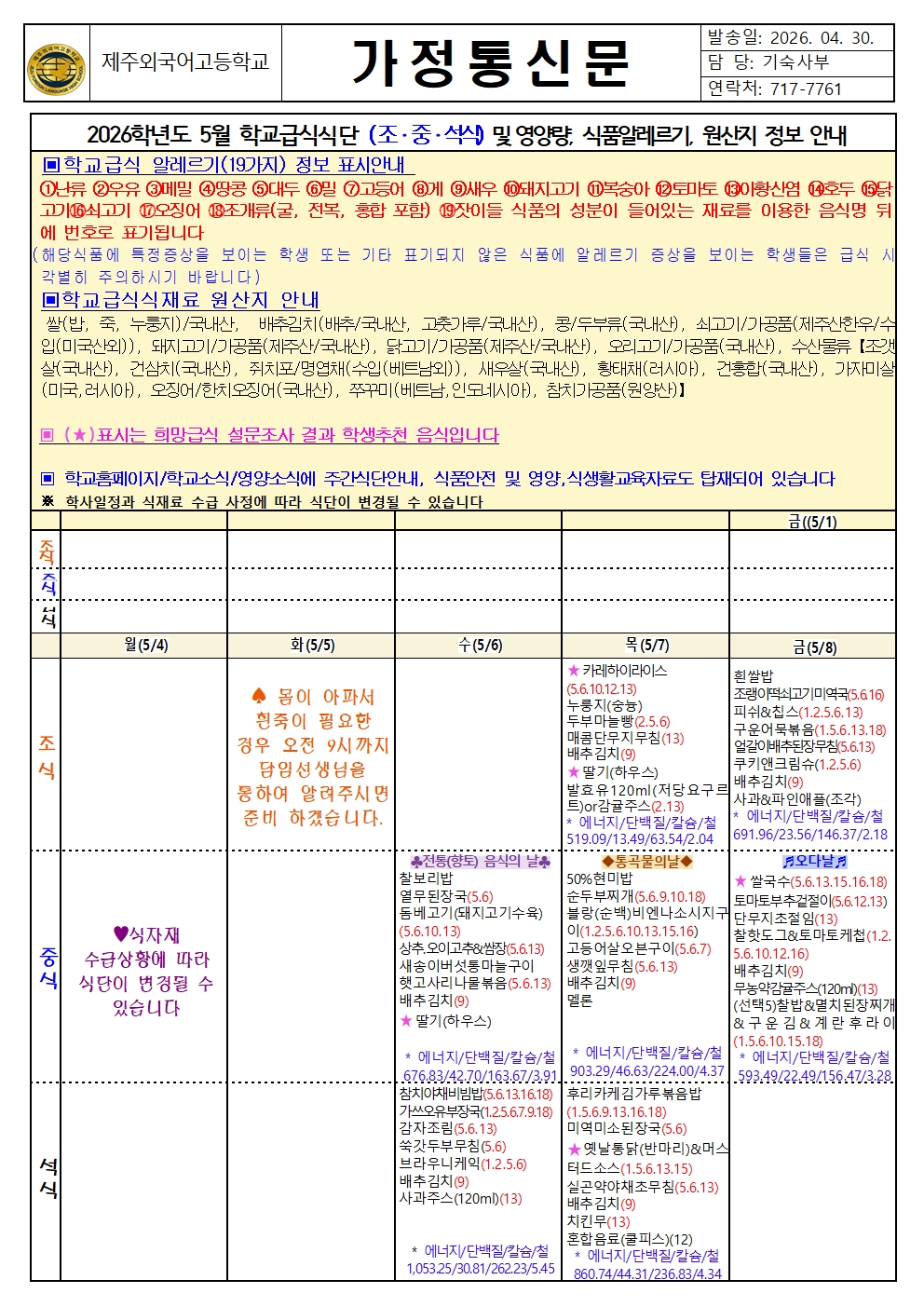 2026년 5월 학교급식 식단(조,중,석식) 및 영양량, 식품알레르기, 원산지 정보 안내