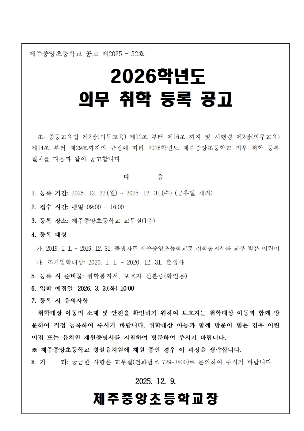 2026학년도 의무 취학 등록(신입생 등록) 공고