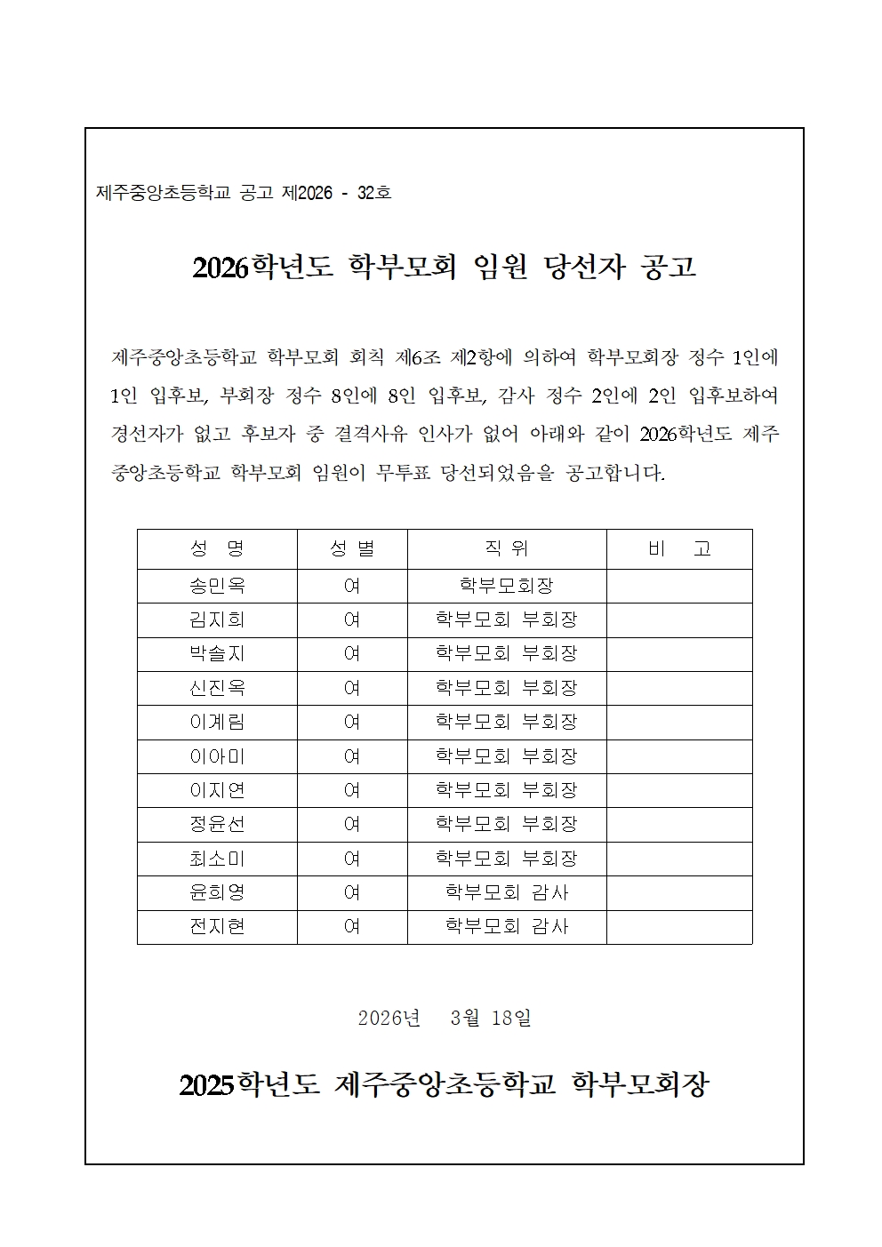 2026학년도 학부모회 임원 당선자 공고
