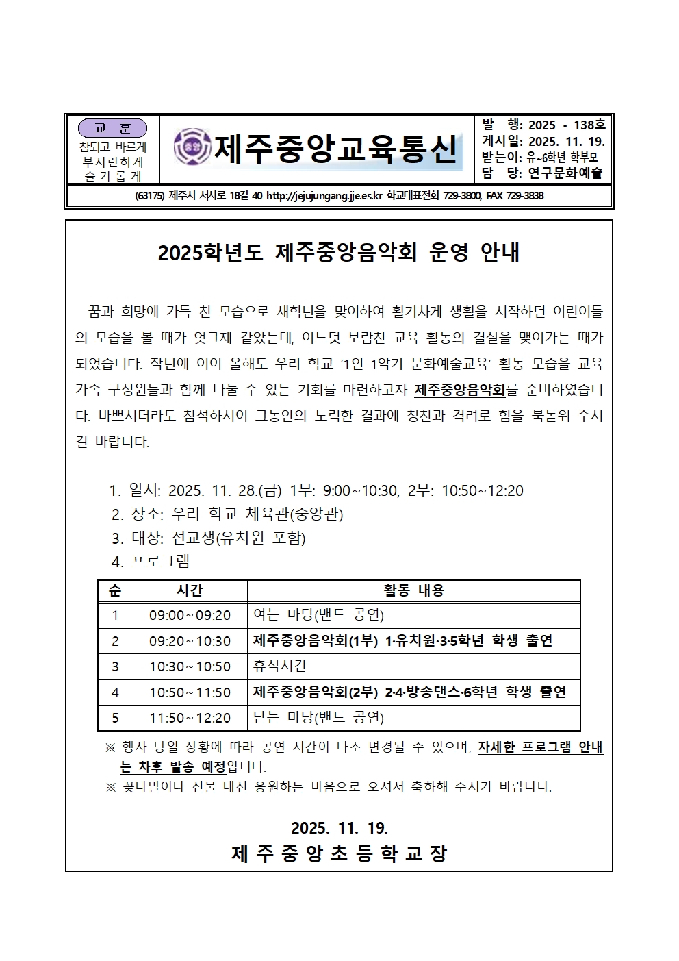 [제2025-138호]2025학년도 제주중앙음악회 운영 안내