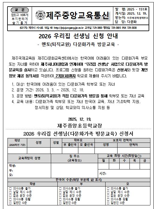 (제20255-151호) 2026 우리집 선생님 신청 안내