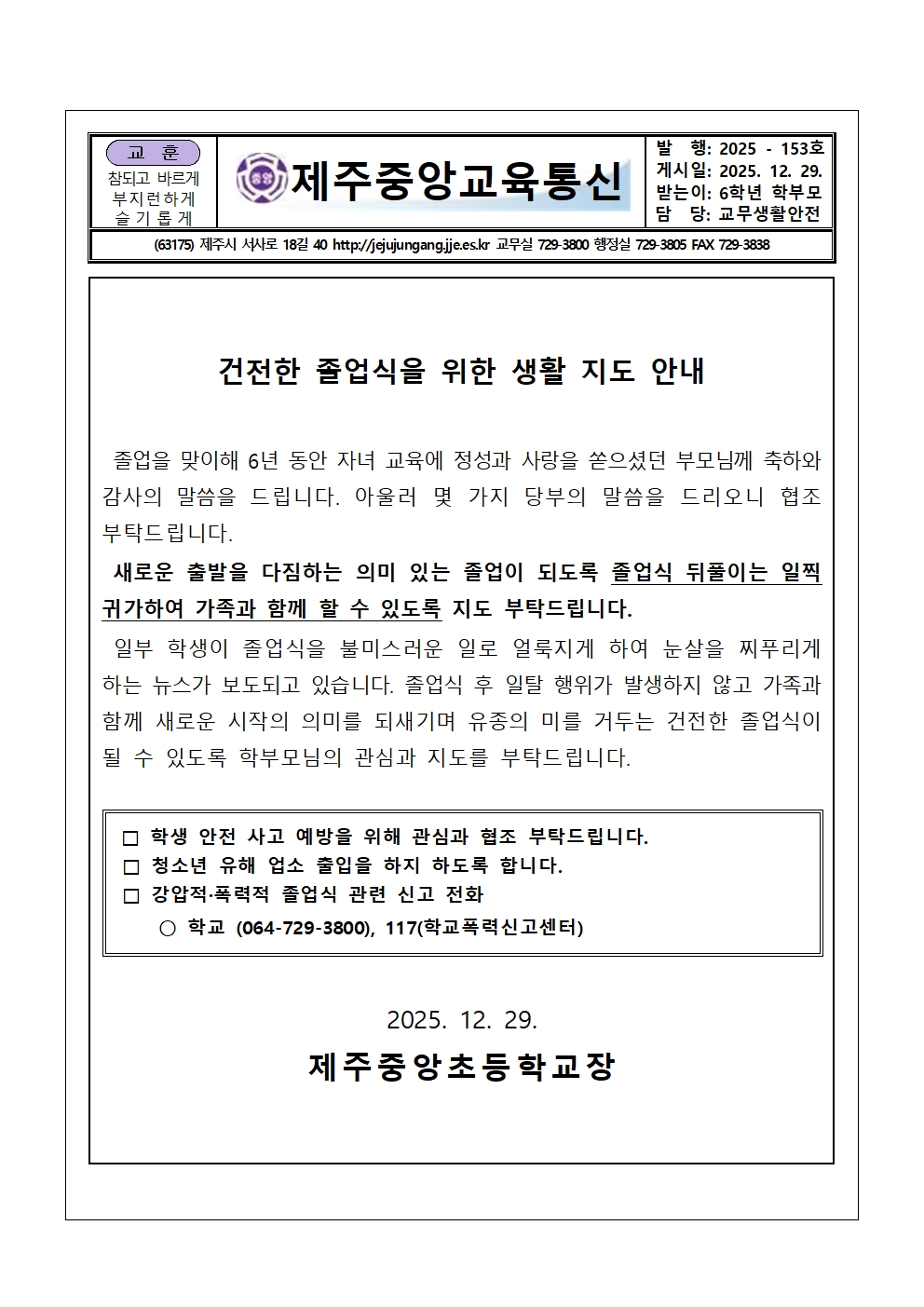 [제2025-153호] 건전한 졸업식을 위한 생활지도 안내