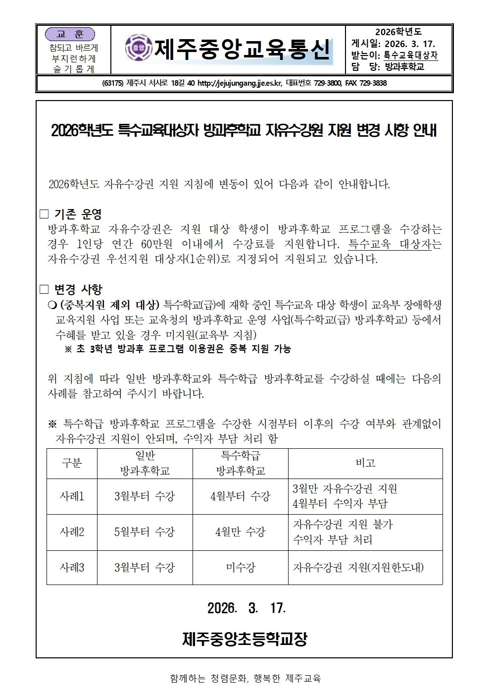 (가정통신문) 2026학년도 특수교육대상자 방과후학교 자유수강원 지원 변경 사항 안내
