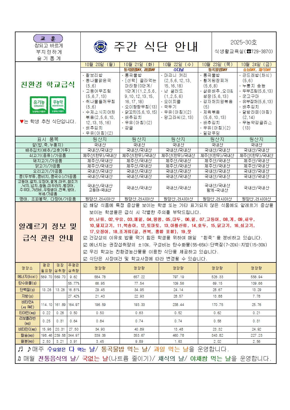 2025. 10월 4주 주간 식단 안내
