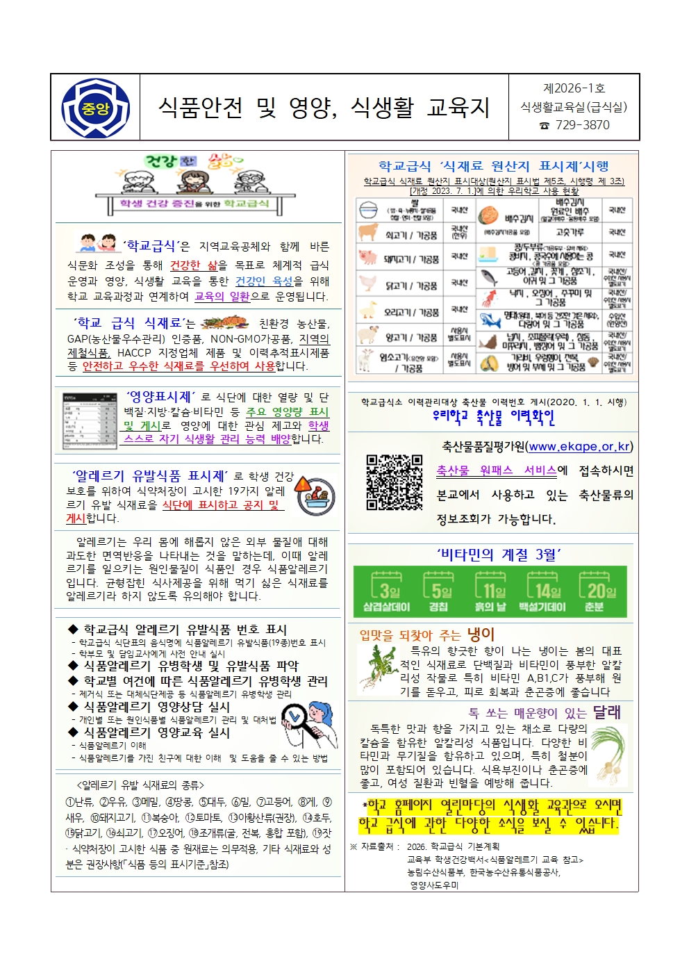 식품안전 및 영양, 식생활 교육지(2026-1호, 학교급식 운영 안내)