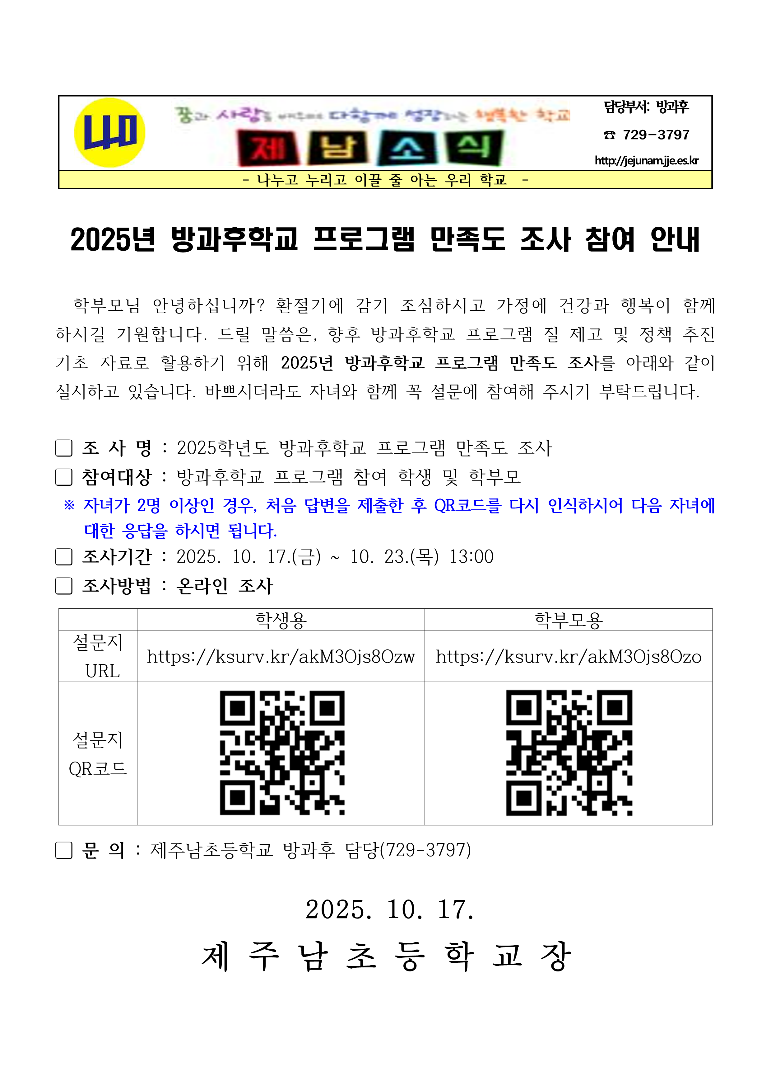 2025학년도 방과후 프로그램 만족도 조사 실시 안내