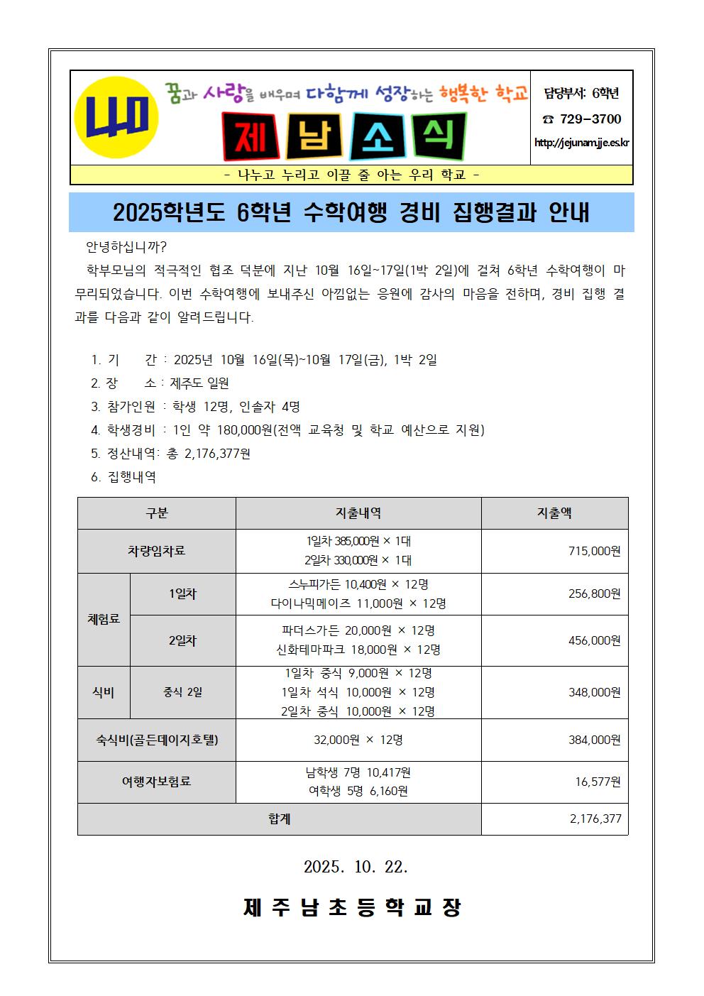 2025학년도 6학년 수학여행 경비 집행 결과 안내