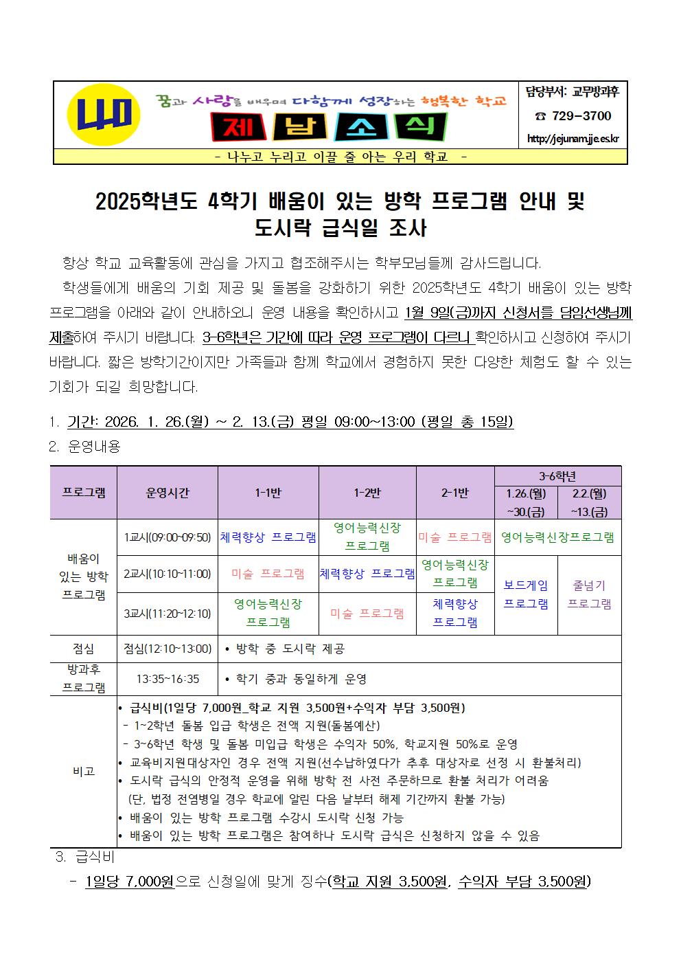 2025학년도 4학기 배움이 있는 방학 프로그램 안내 및 도시락 급식일 조사