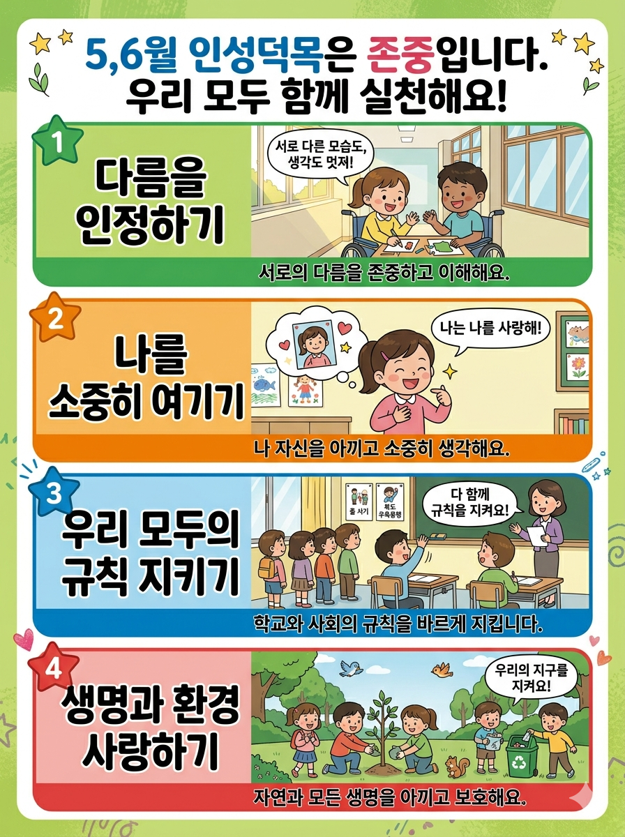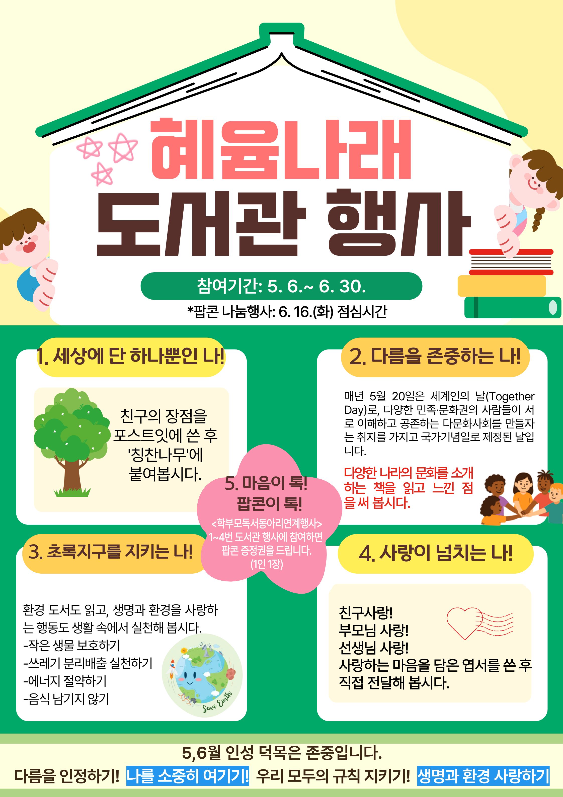 5,6월 인성덕목 <존중> 과 관련한 도서관 행사입니다. 많은 학생들이 참여할 수 있도록 학부모님의 관심 부탁드립니다. ^^