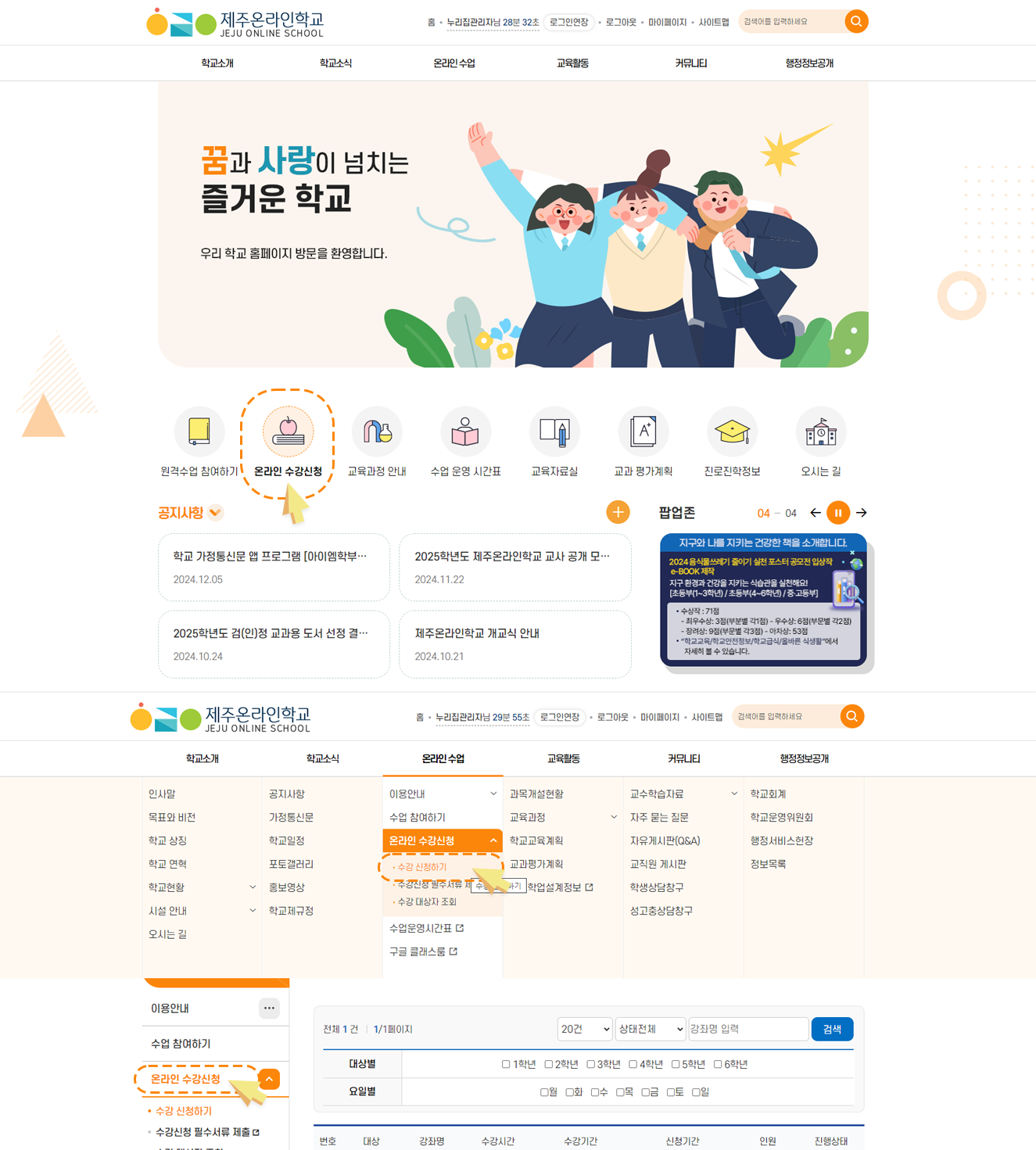 첫 화면 위젯 ‘온라인 수강신청’ 또는 메인 메뉴 ‘온라인 수업’> 온라인 수강신청 > ‘수강신청하기’ 클릭