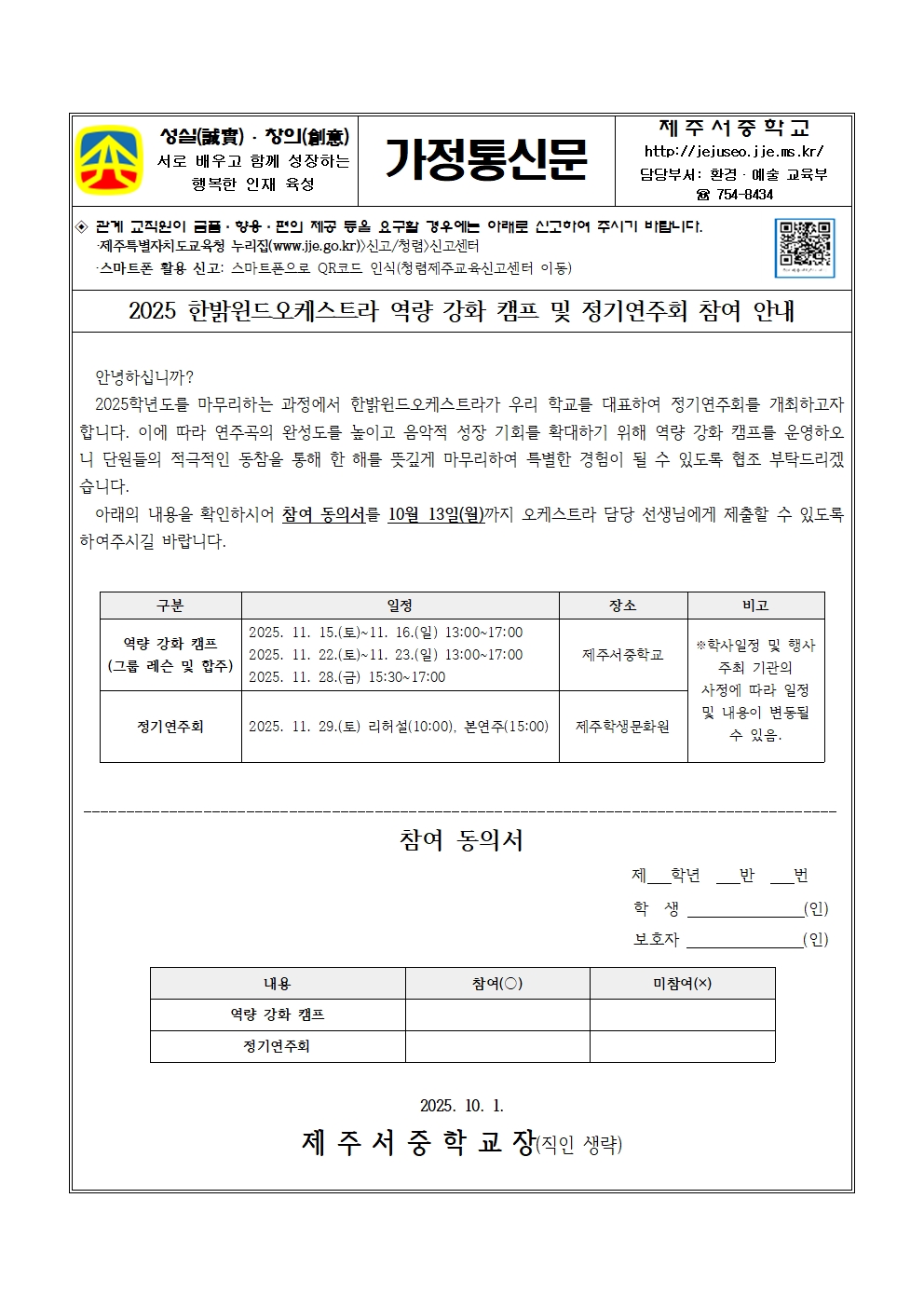 2025학년도 한밝윈드오케스트라 역량 강화 캠프 및 정기연주회 참여 안내 가정통신문