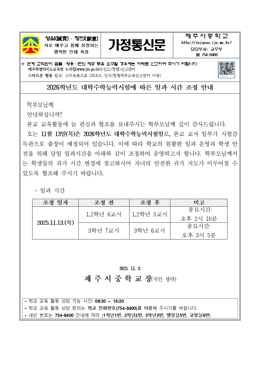 [제주특별자치도교육청 가정통신문]「2026년 진로교육 활성화 계획」 수립을 위한 설문조사 안내