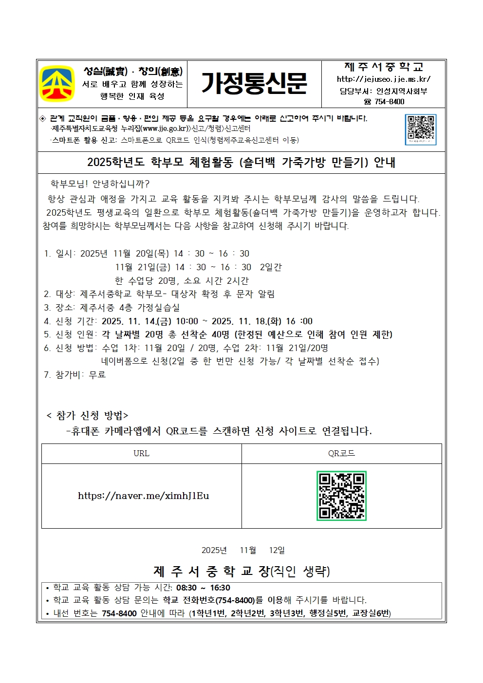 2025 학부모 체험활동(숄더백 가죽가방 만들기) 신청 안내