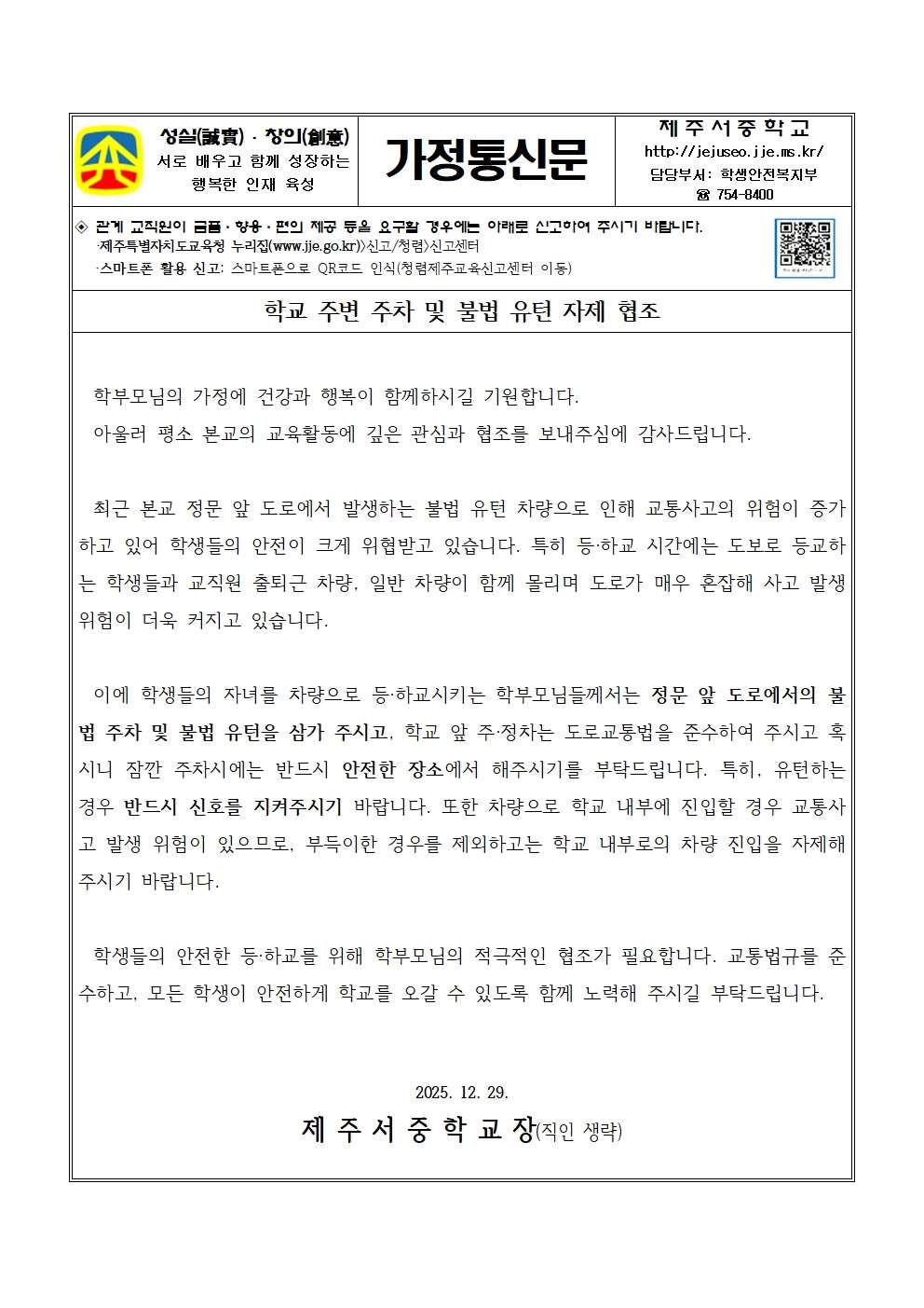 학교 주변 불법 유턴 자제 협조 가정통신문