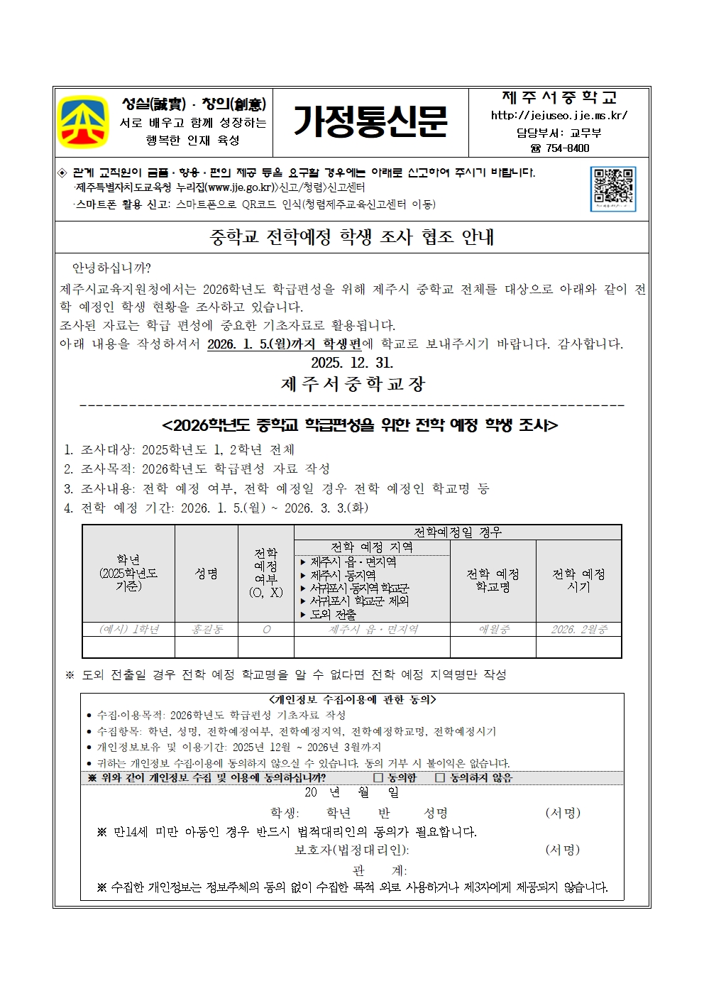 [제주시교육지원청 가정통신문] 2026~2027학년도 제주시교육지원청 학교폭력대책심의위원회 학부모 위원 모집 안내