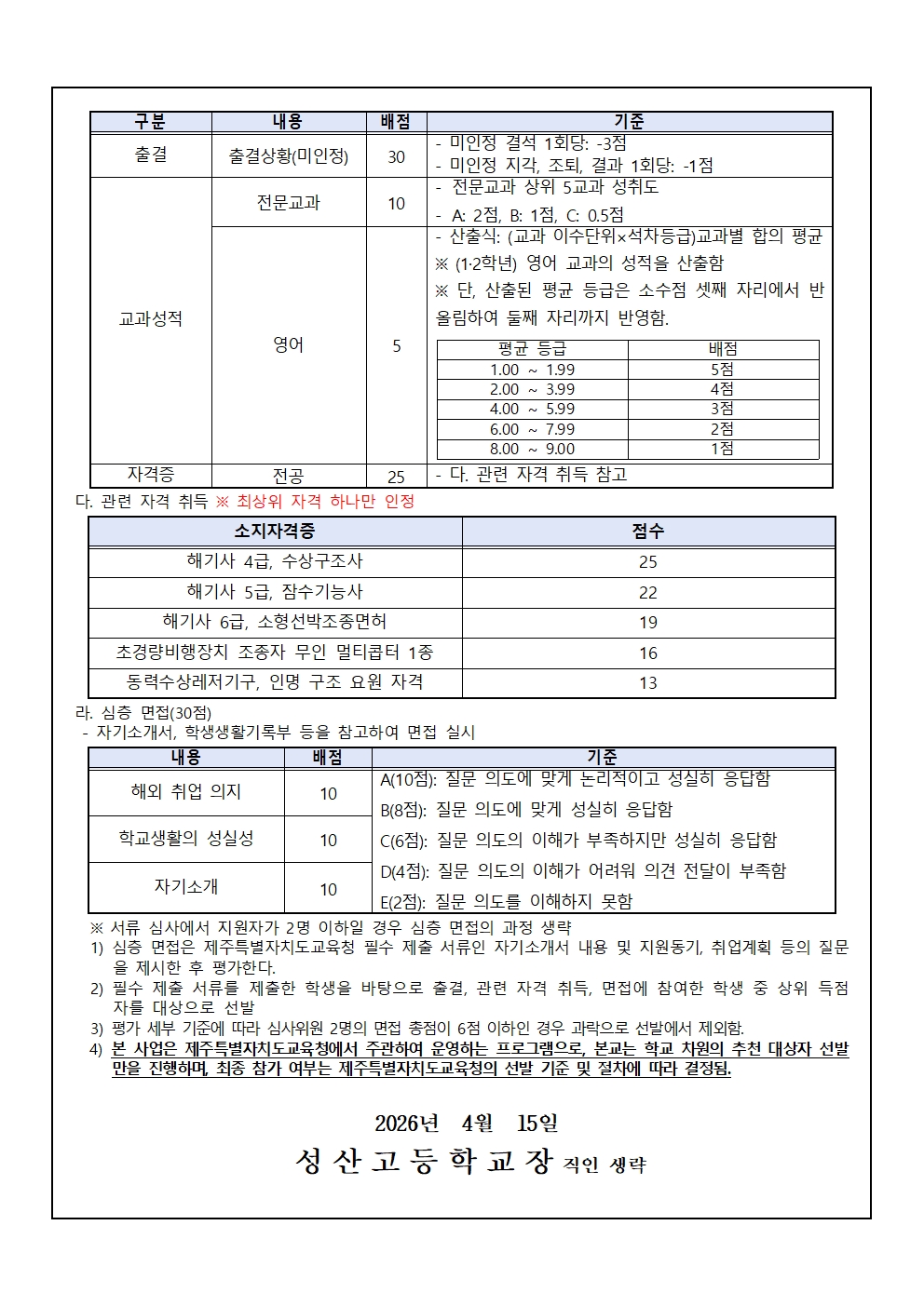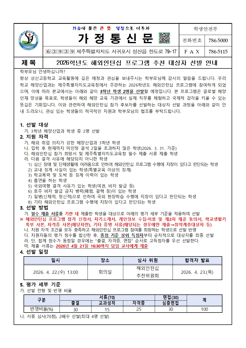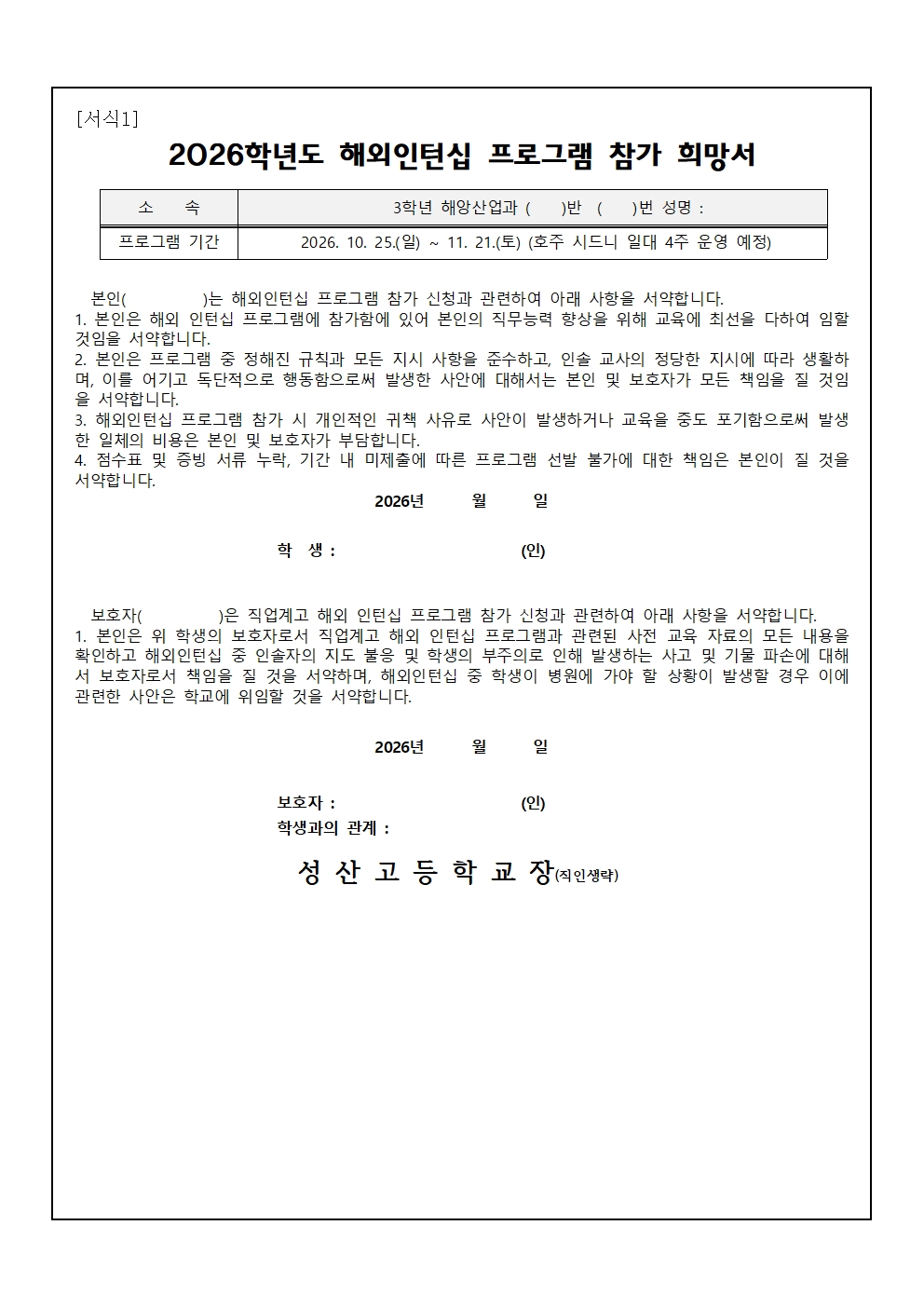 2026학년도 해외인턴십 프로그램 추천 대상자 선발 안내 가정통신문입니다. 참가를 희망하는 학생과 학부모께서는 가정통신문 내 신청서와 붙임의 제출 서류 양식 모음을 작성하여 2026년 4월 21일 화요일까지 담임선생님께 제출 바랍니다.