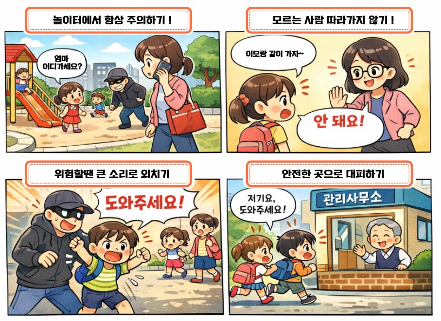 또한, 아이들에게 아래와 같은 안전 수칙을 가정에서도 반복적으로 지도해 주시기 바랍니다.