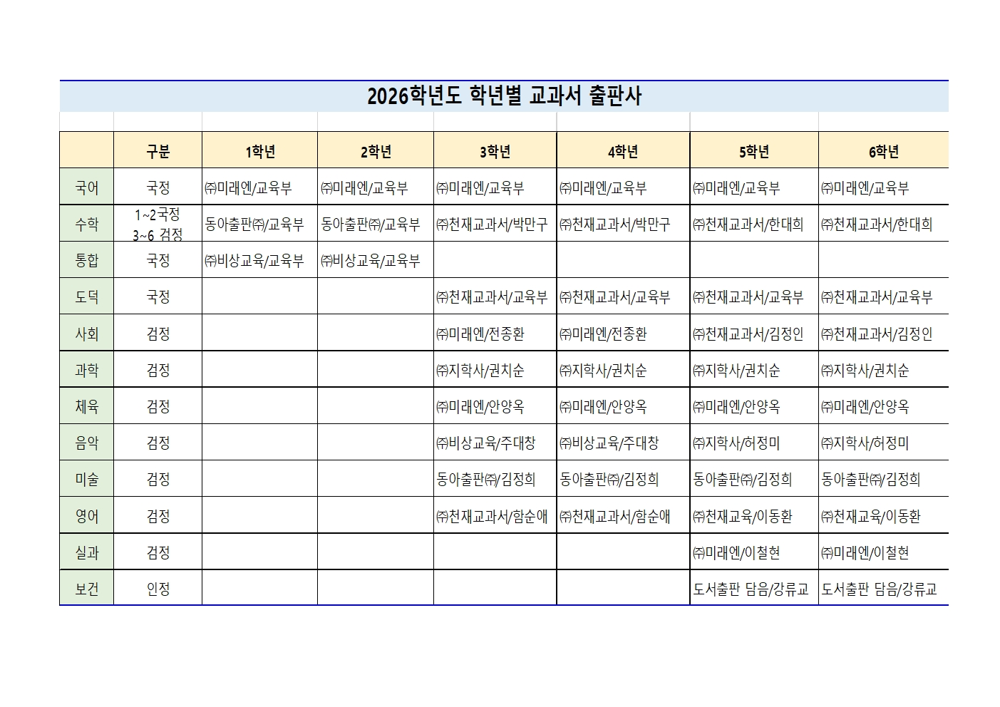 2026학년도 교과서 출판사 안내
