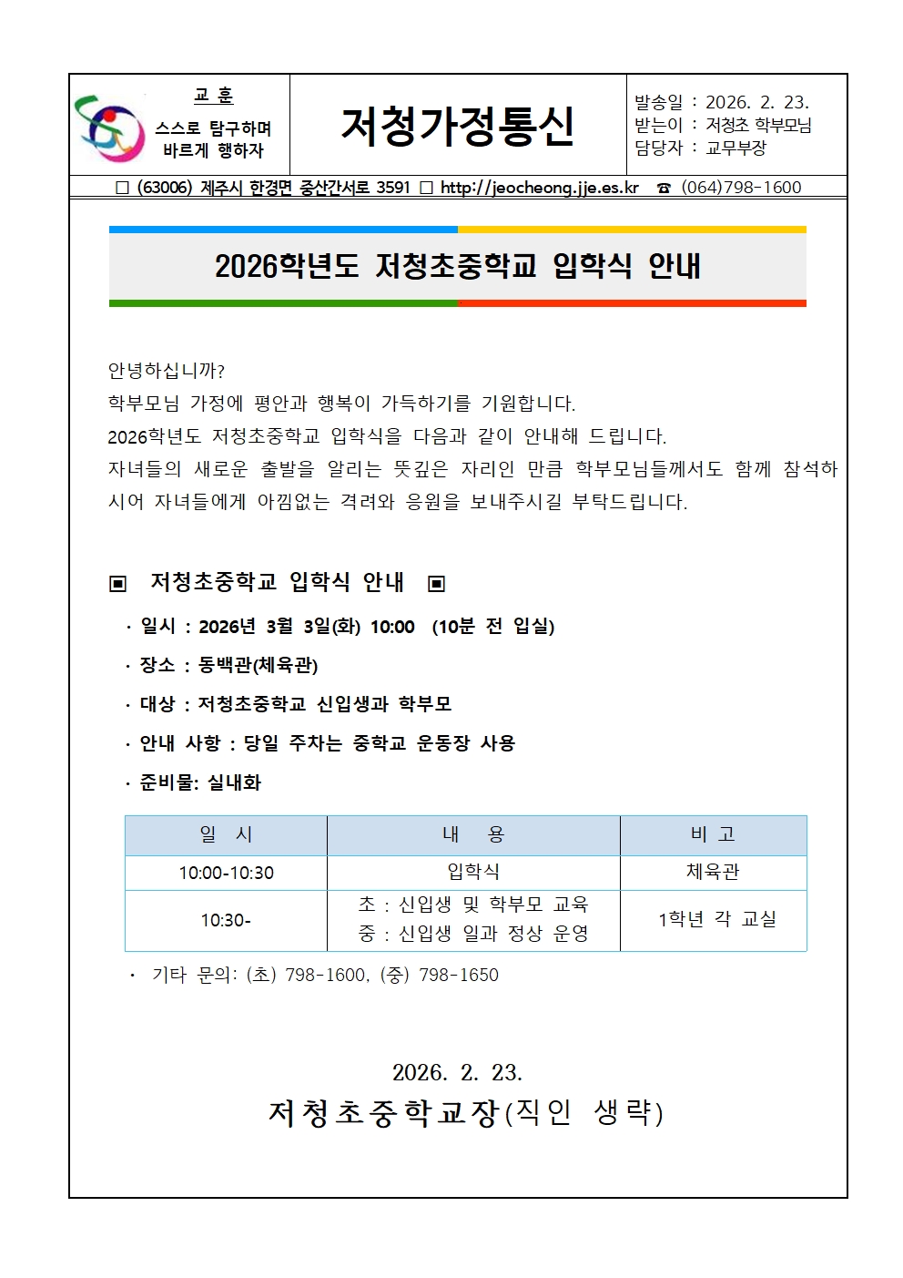 [제주특별자치도교육청 가정통신문] 건강한 학교생활을 위한 2026년 초,중학교 입학생 예방접종 확인 안내