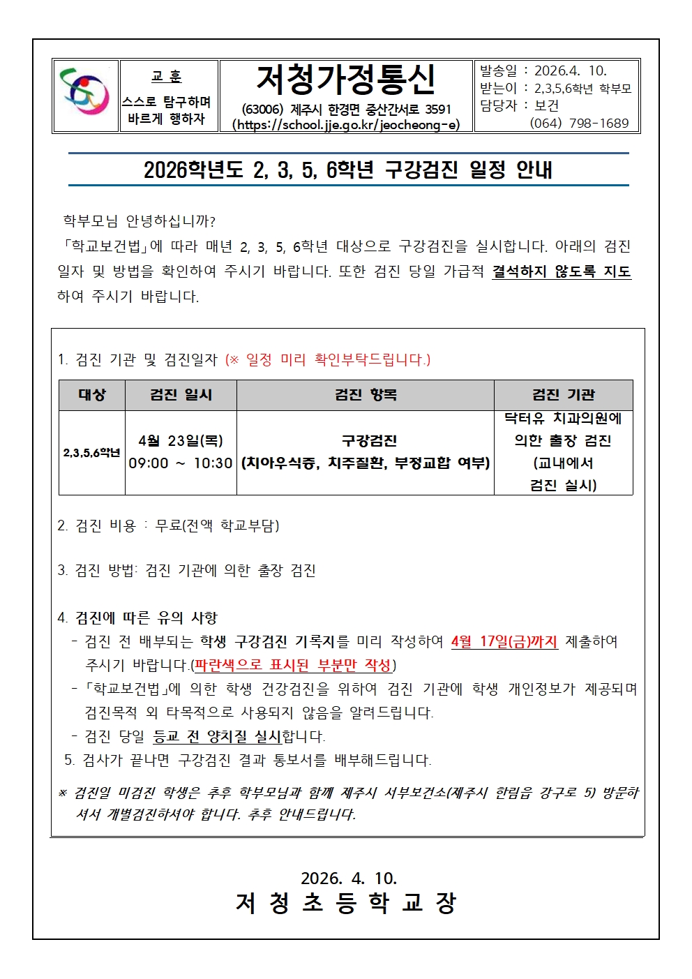 2026학년도 2, 3, 5, 6학년 구강검진 일정 안내