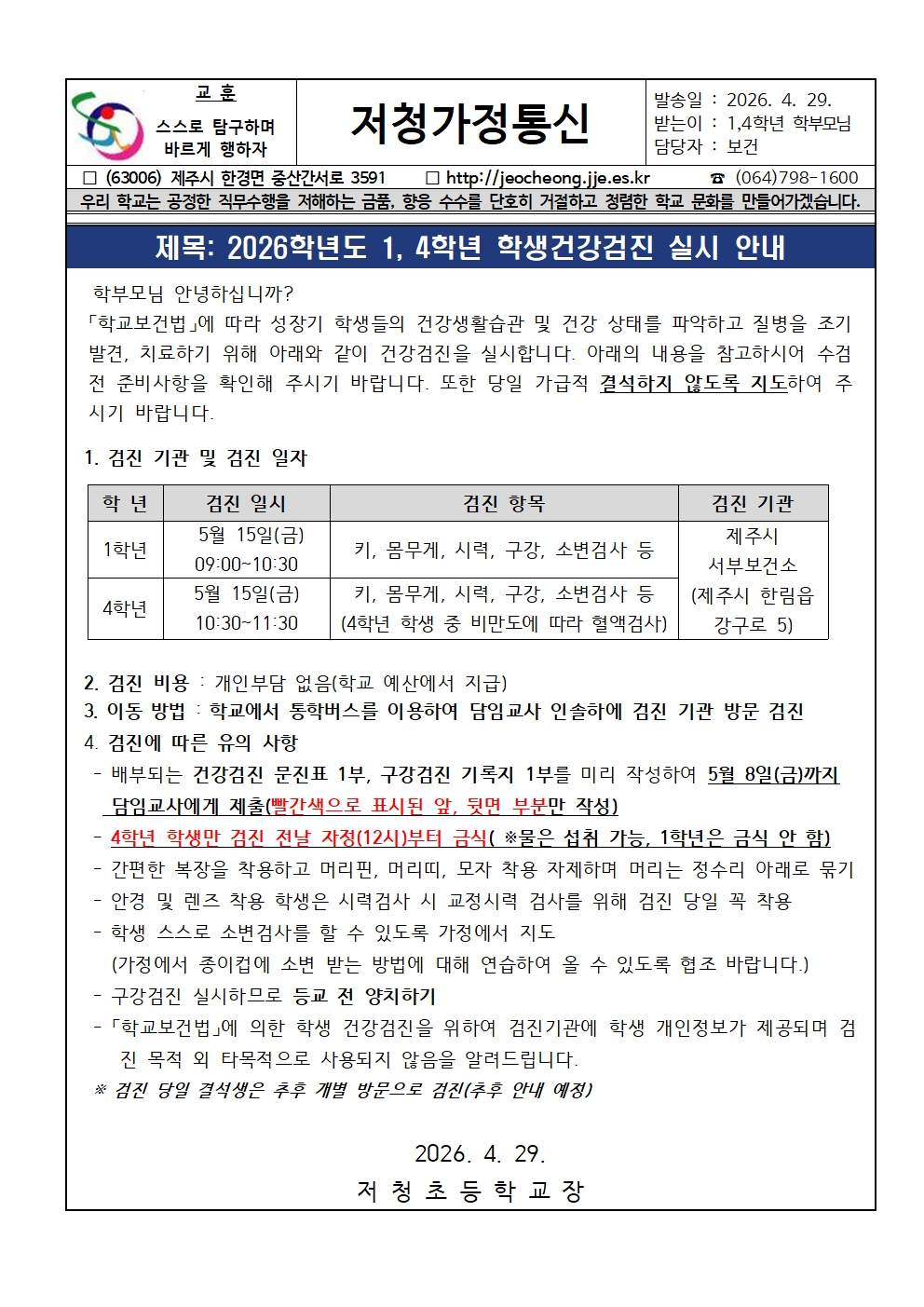 2026학년도 1,4학년 학생건강검진 실시 안내