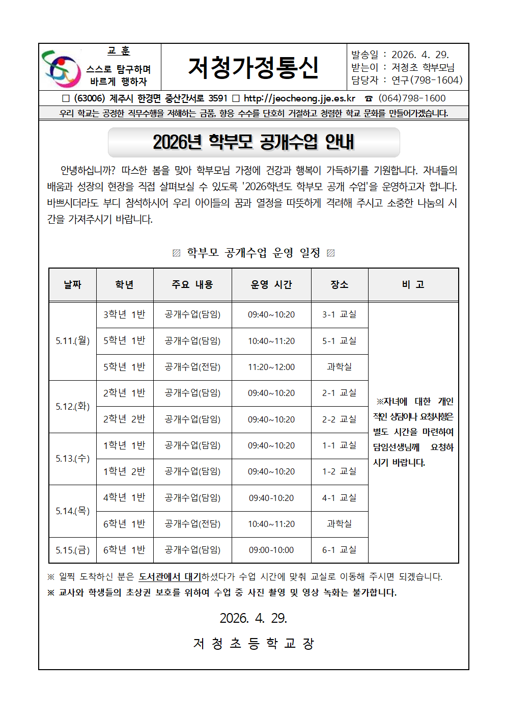 2026년 학부모 공개수업 안내