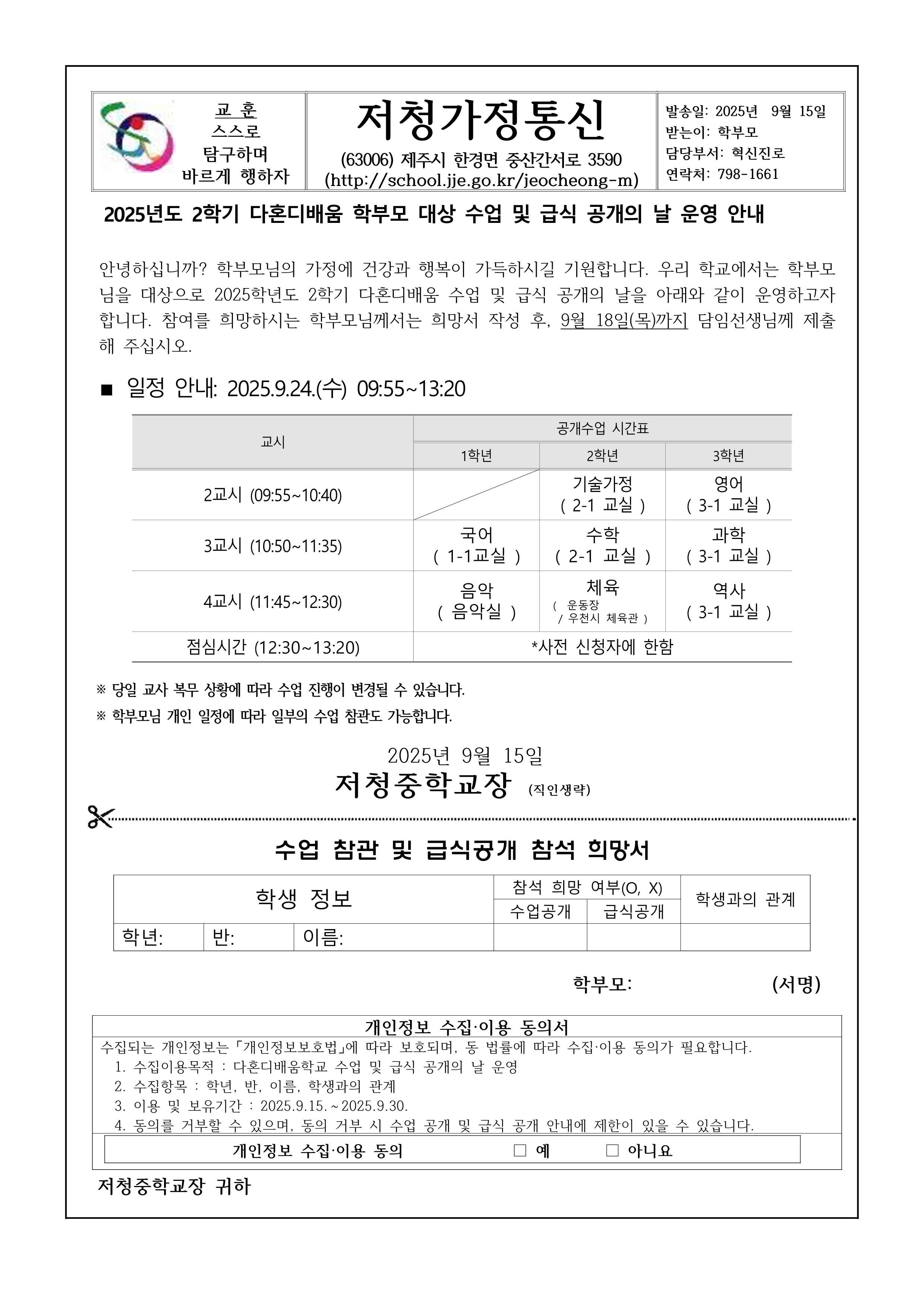 2025학년도 2학기 학부모 대상 수업 및 급식공개의 날 가정통신문 안내합니다.