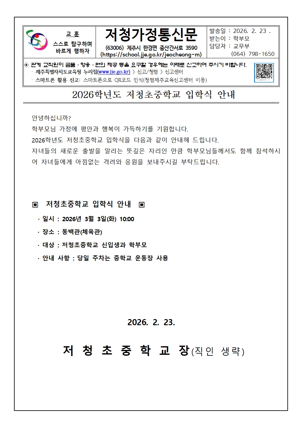 [제주특별자치도교육청 가정통신문] 건강한 학교생활을 위한 2026년 초,중학교 입학생 예방접종 확인 안내