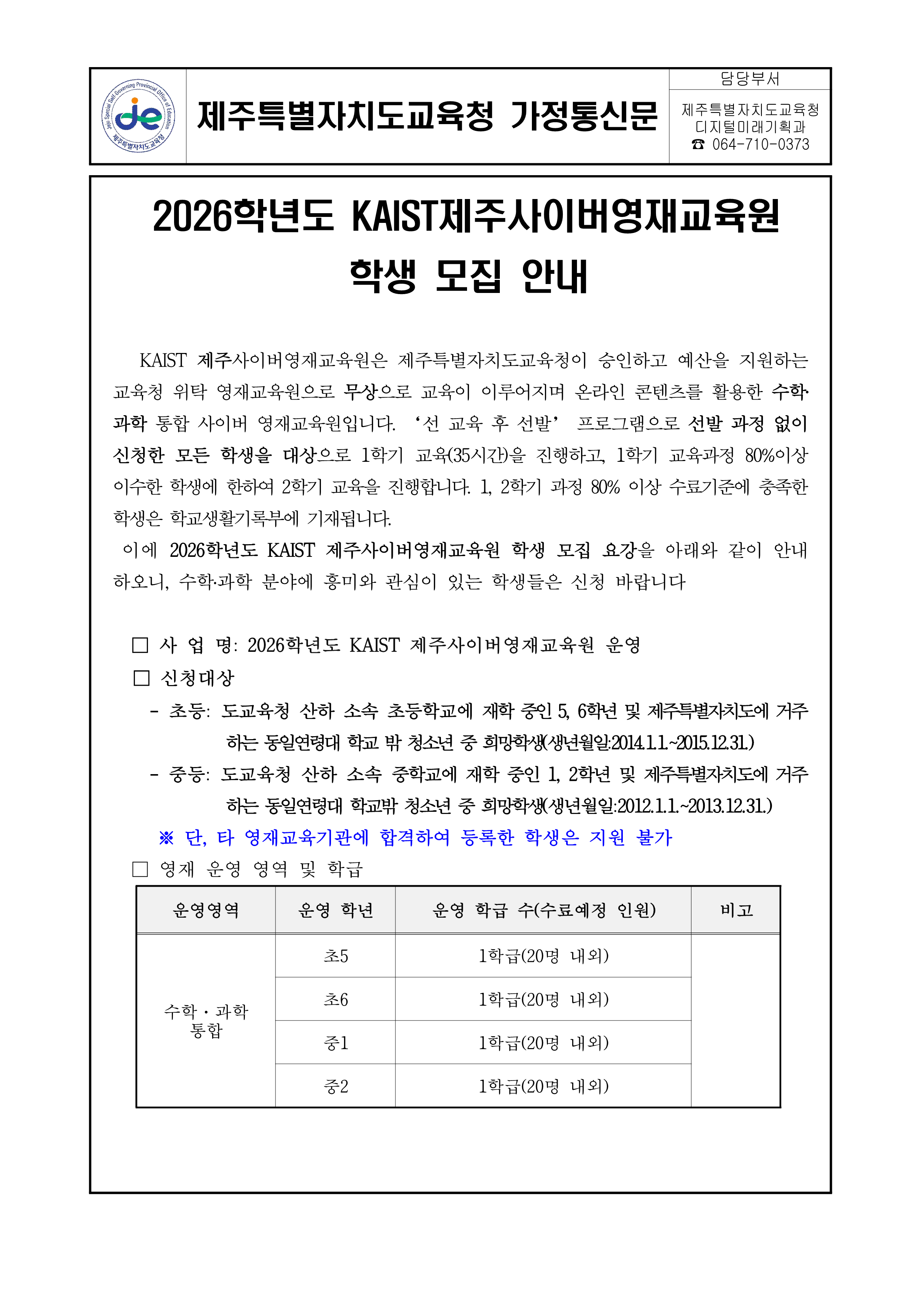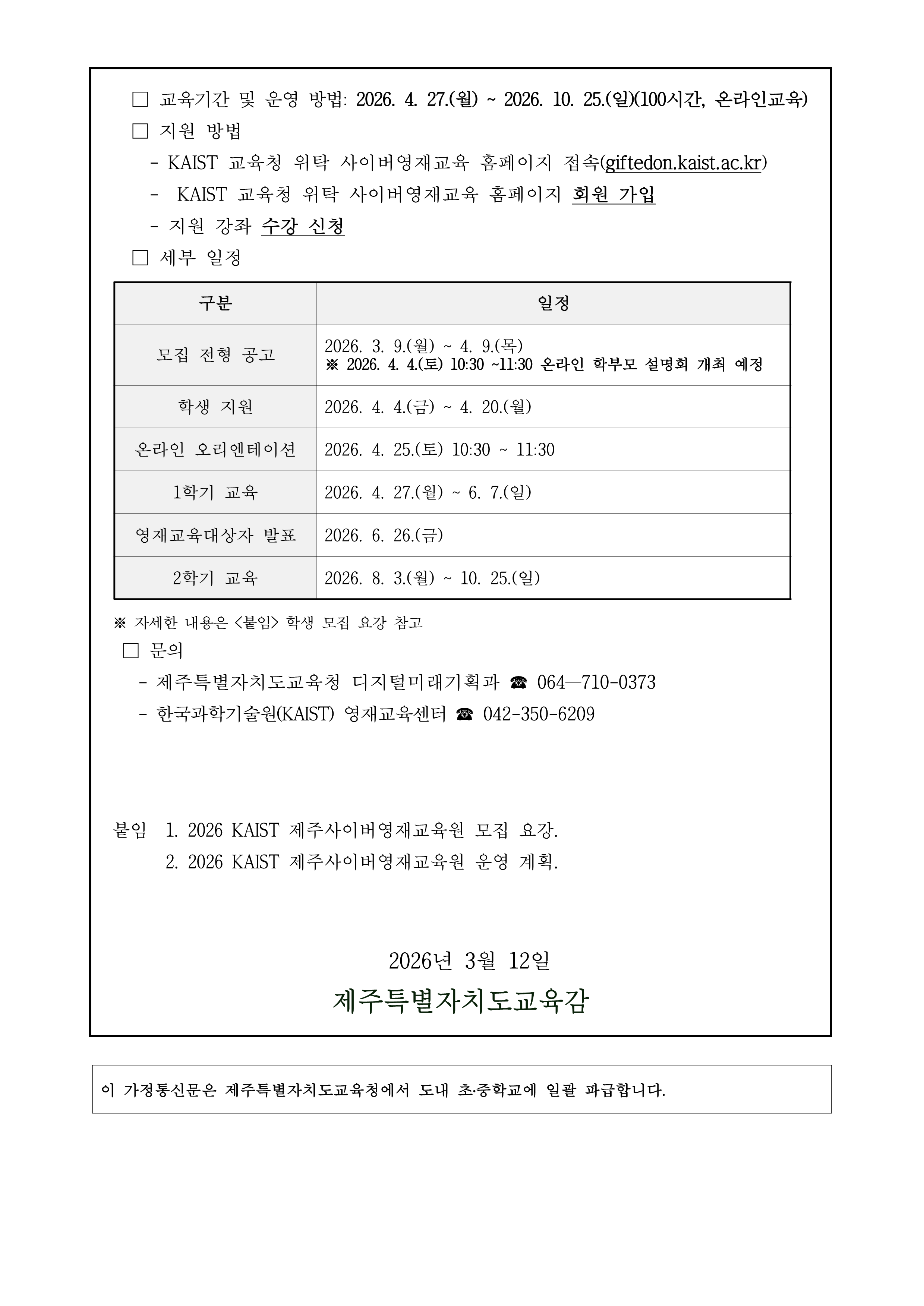 [제주도교육청가정통신문] 2026학년도 KAIST 제주사이버영재교육원 영재교육대상자 모집 요강 및 신청안내