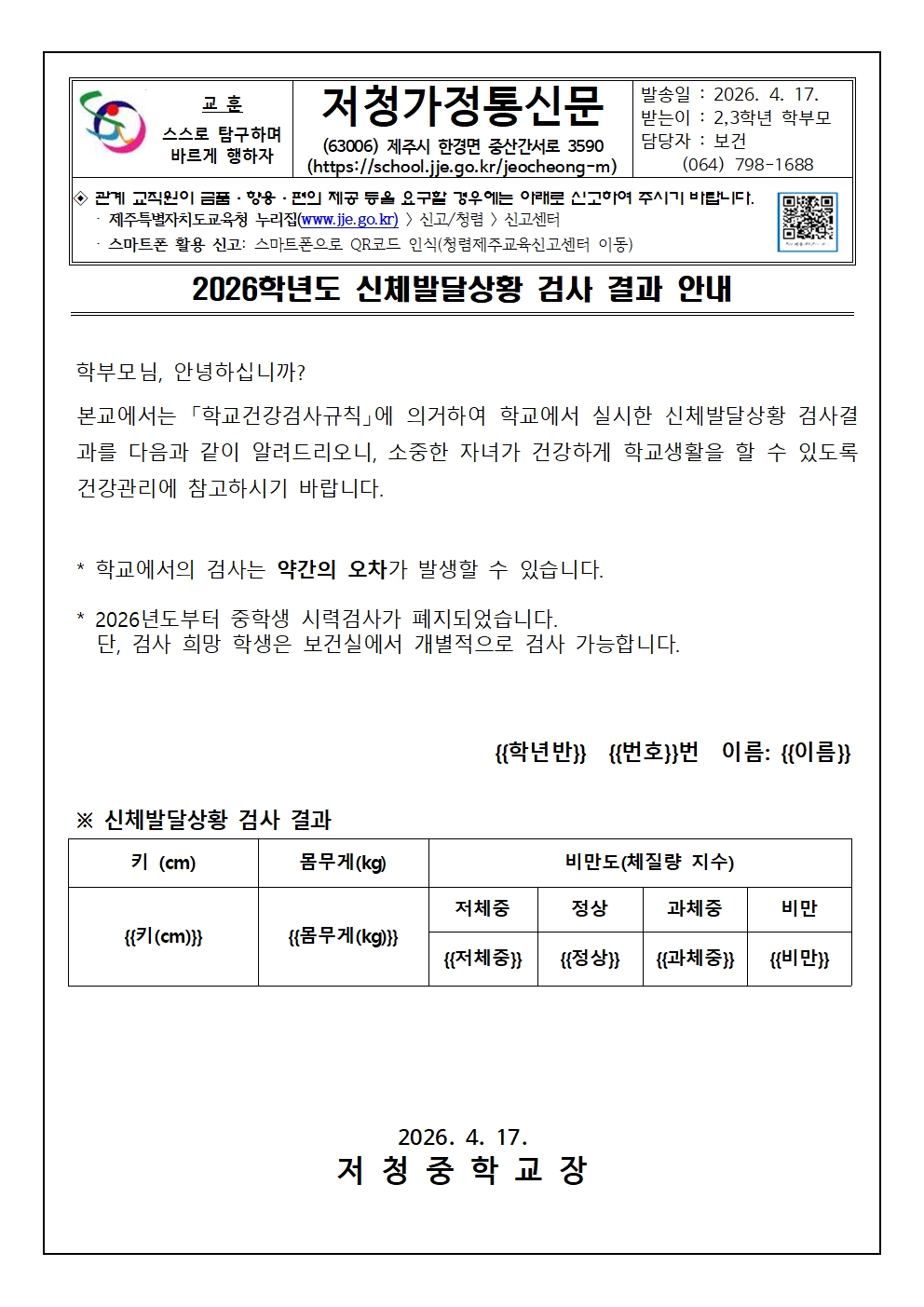 2026학년도 신체발달상황 검사 결과 안내