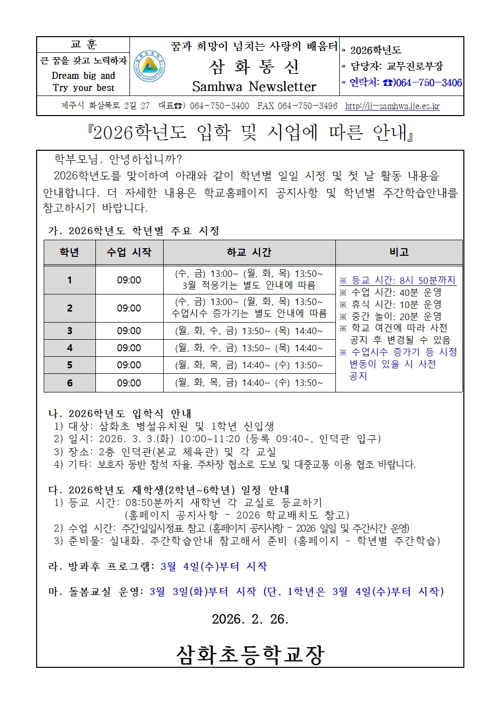 2026학년도 입학 및 시업에 따른 안내