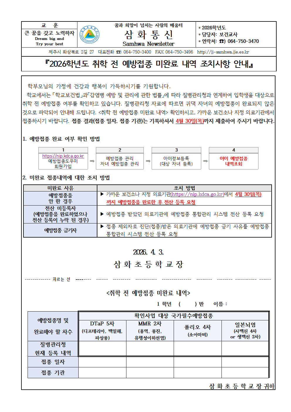 2026학년도 취학 전 예방접종 미완료 내역 조치사항 안내