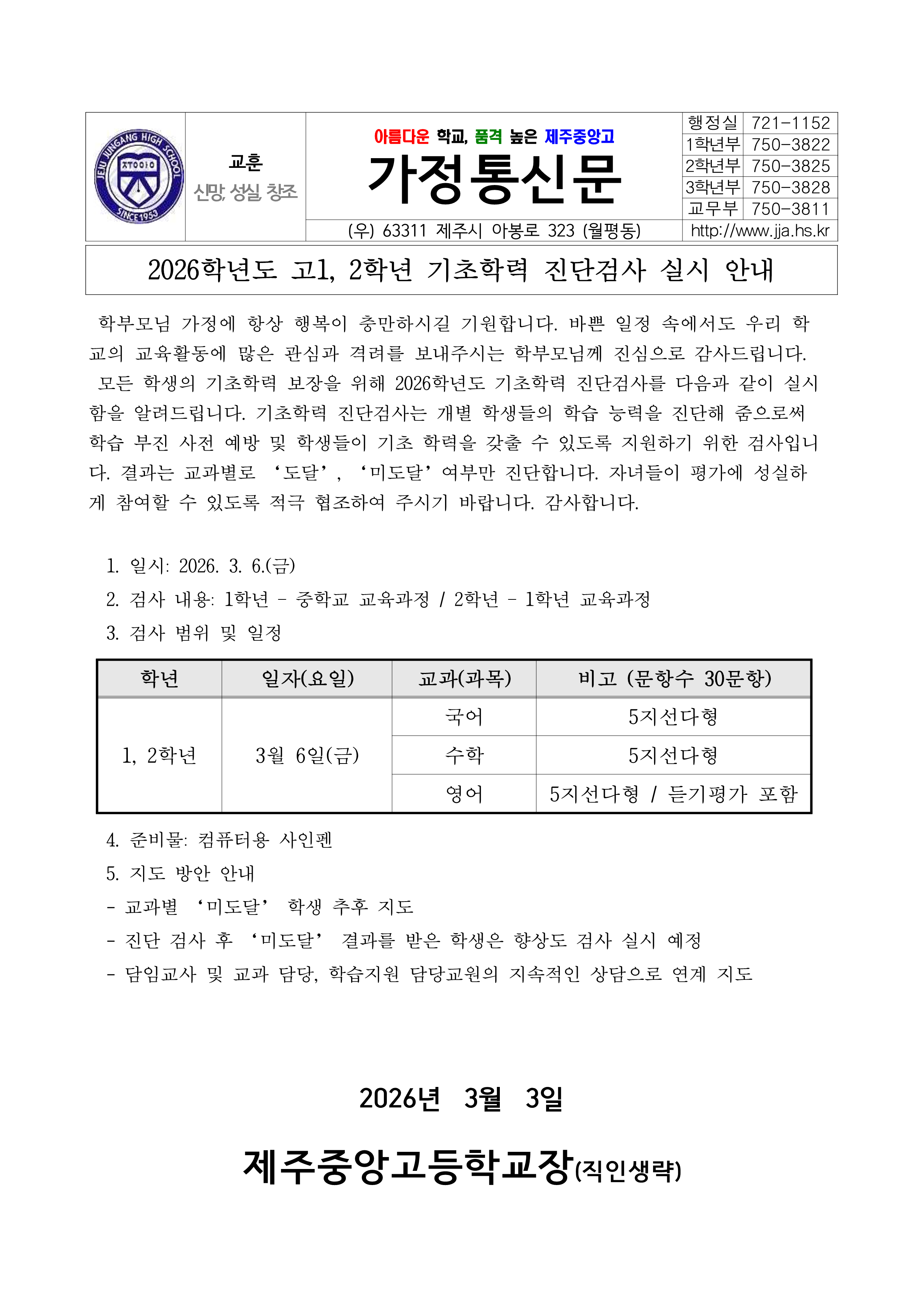 2026학년도 고 1, 2학년 기초학력 진단검사 실시 안내