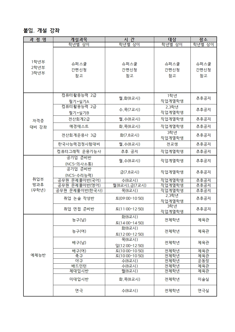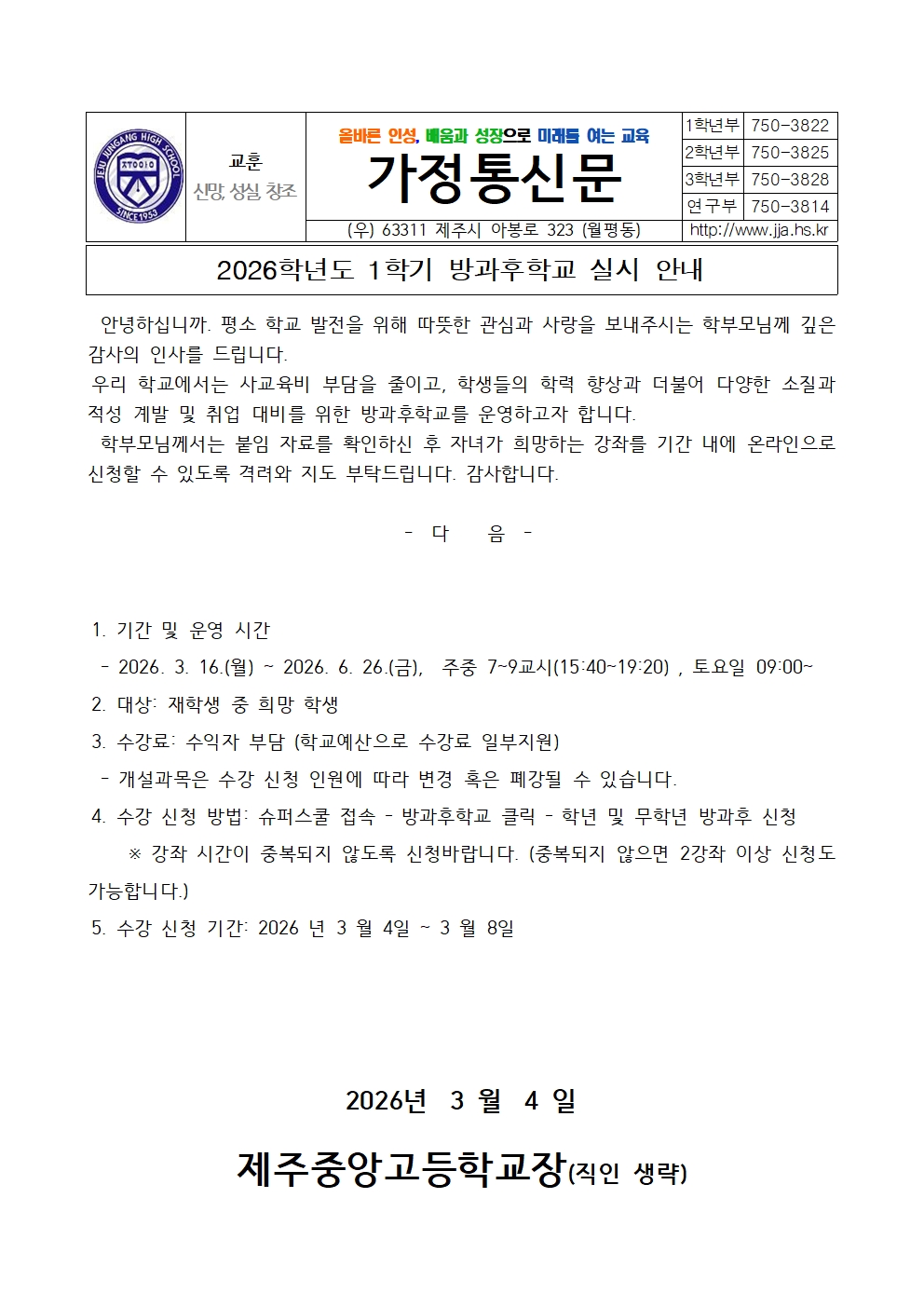 2026학년도 1학기 방과후학교 실시 안내