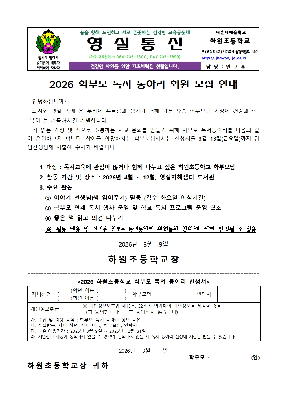 2026학년도 학부모 독서 동아리 모집 안내 가정통신문