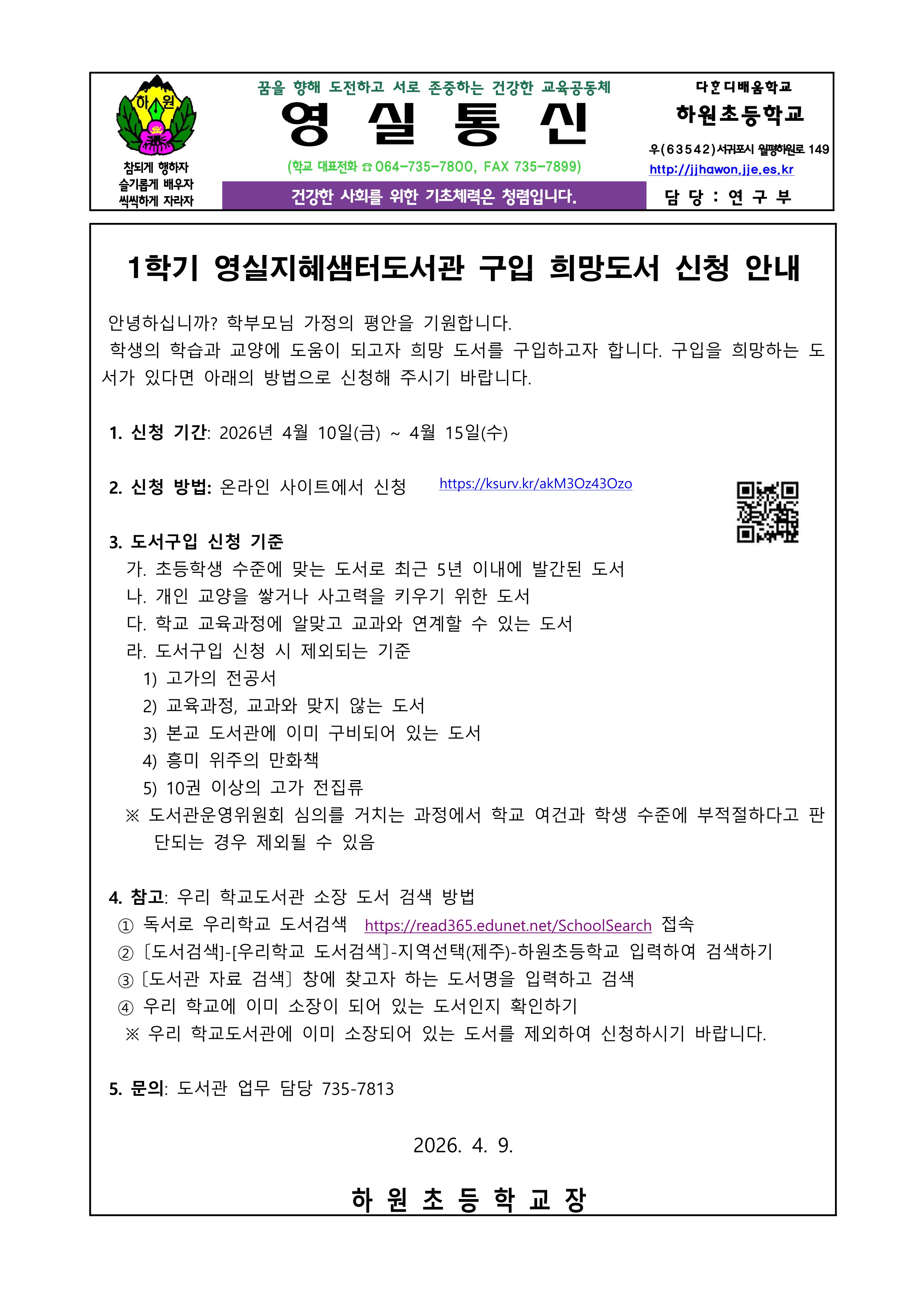 1학기 영실지혜샘터도서관 구입 희망도서 신청 안내