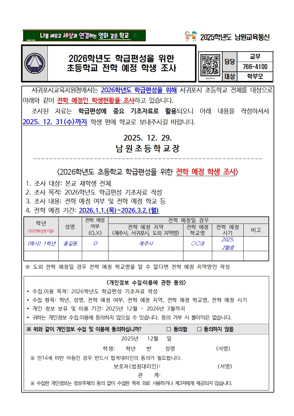 2026학년도 학급 편성을 위한 초등학교 전학 예정 학생 조사