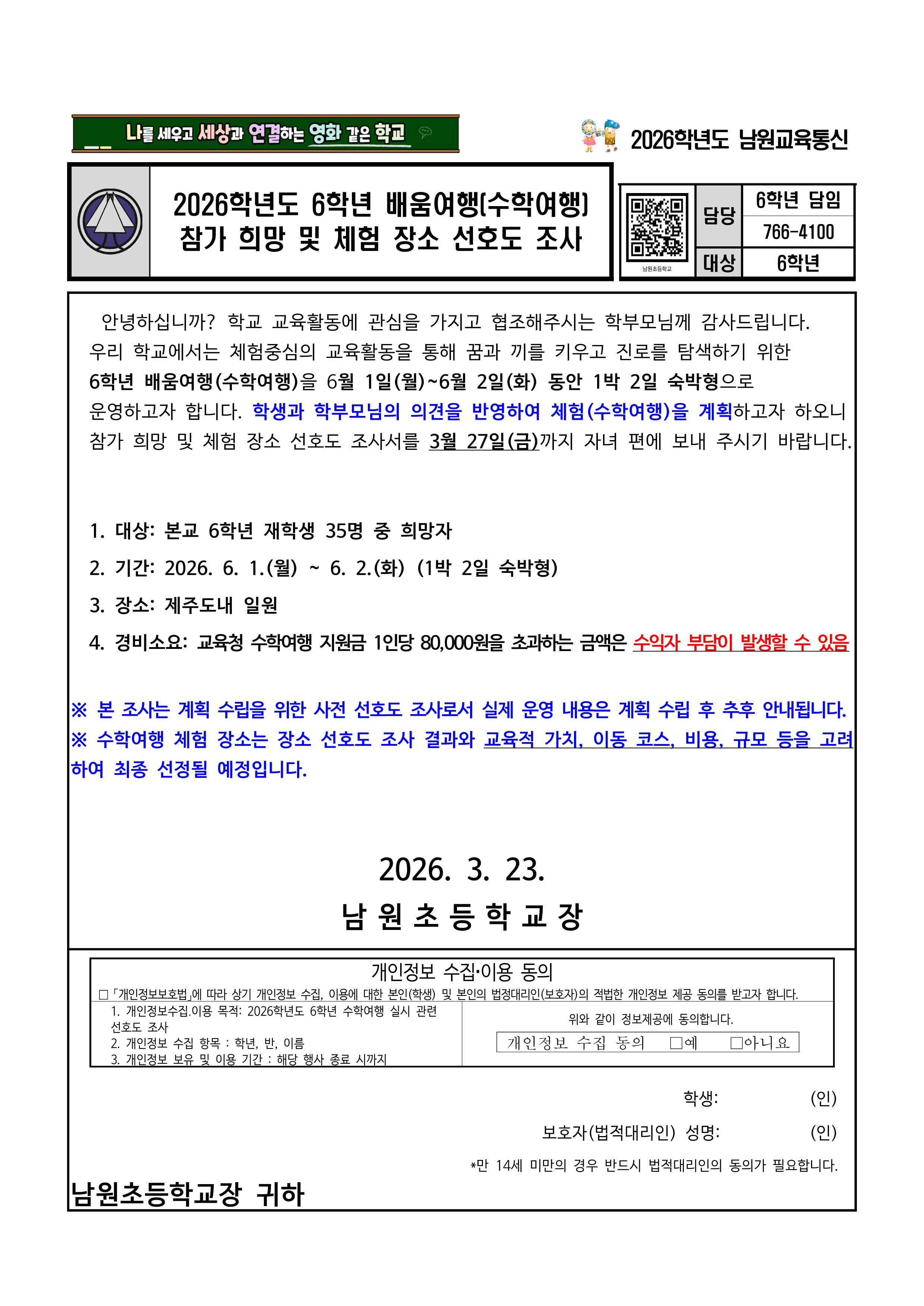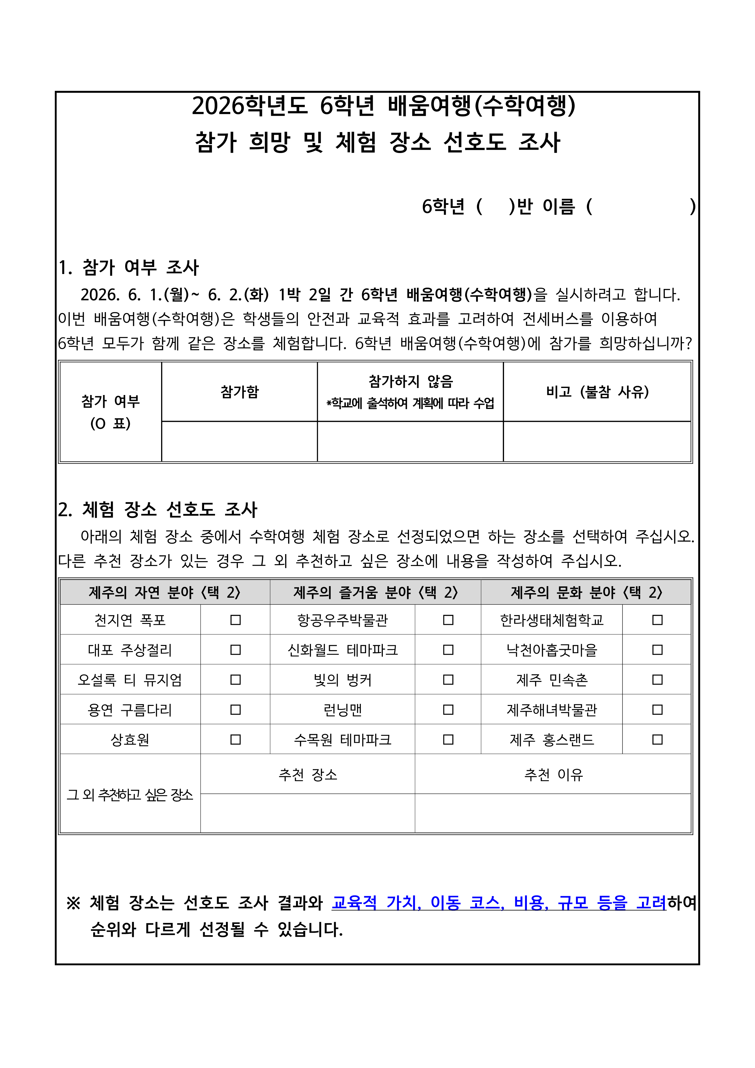 2026학년도 배움여행(수학여행) 참가 희망 및 체험 장소 선호도 조사
