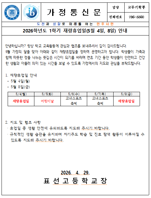 2026학년도 5월(6·7·27·29일) 일과시간 조정 안내